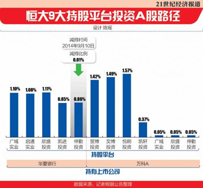 8月8日晚間,一南一北兩家上市房企同日披露權(quán)益變動(dòng)報(bào)告書,增持者都是恒大集團(tuán)。南方的上市房企是仍處在控股權(quán)大戰(zhàn)旋渦的萬科A,北方的則是廊坊發(fā)展(600149.SH)。 權(quán)益變動(dòng)報(bào)告書顯示,萬科A和廊坊發(fā)展都被恒大舉牌。截至目前,恒大持有萬科A5%股份,為第四大股東;持有廊坊發(fā)展15%股份,躍居其第一大股東。 隨著恒大在A股不斷出擊,其持股平臺(tái)逐漸浮水。據(jù)21世紀(jì)經(jīng)濟(jì)報(bào)道記者梳理,從舉牌華夏銀行(600015.SH)到舉牌萬科A,恒大旗下的持股平臺(tái)多達(dá)9家。 近期內(nèi),恒大集團(tuán)控股嘉凱城(000918.SZ)、成為廊坊發(fā)展第一大股東、舉牌萬科等三大手筆斥資已達(dá)到176億元,并且均稱系“自有資金”。 那么恒大用于投資A股的自有資金到底有多少? 據(jù)21世紀(jì)經(jīng)濟(jì)報(bào)道記者調(diào)查,實(shí)際上恒大近兩年通過A股、H股投資等收獲頗豐,并且在去年年中A股大跌前成功高位減持,大約有134億元的資金可供使用。不過,如果繼續(xù)下一步增持,資金來源則可能超出自有資金范疇,比如恒大集團(tuán)計(jì)劃未來12個(gè)月內(nèi)繼續(xù)增持廊坊發(fā)展,使用資金為“自有資金或其他合法途徑自籌資金”。 進(jìn)擊資本市場(chǎng)同時(shí),恒大經(jīng)營方面亦放出豪言壯語。8月9日,恒大(HK.3333)公告,將2016年銷售目標(biāo)上調(diào)至3000億(人民幣,下同),較原目標(biāo)2000億大增50%,也較2015年2013.4億銷售額大幅提升49%。 數(shù)據(jù)顯示,前七月恒大已實(shí)現(xiàn)銷售1847.9億,同比增幅高達(dá)82.6%。其中7月單月銷售額更達(dá)到430.1億,同比增205%,創(chuàng)下房企單月銷售的最高紀(jì)錄。 9家持股平臺(tái)浮水 資本市場(chǎng)上,龐大的資本系設(shè)立多個(gè)“馬甲”用于資本運(yùn)作成為一大套路,恒大也不例外。 “一些影響較大的集團(tuán)舉牌的時(shí)候?yàn)榱瞬灰鹛笞⒁,就?huì)動(dòng)用一些不起眼的公司當(dāng)馬甲,類似于房地產(chǎn)公司拍地的時(shí)候!蓖咦稍冄芯靠偙O(jiān)張宏偉表示,比如雖然有多家馬甲公司購買了萬科A,但同受恒大控制。 廊坊發(fā)展披露的詳式權(quán)益變動(dòng)報(bào)告書顯示,對(duì)其實(shí)施增持、舉牌的主體是恒大地產(chǎn)集團(tuán),動(dòng)機(jī)主要是充分把握京津冀一體化的政策契機(jī),對(duì)上市公司未來發(fā)展前景看好。 不過,21世紀(jì)經(jīng)濟(jì)報(bào)道記者注意到,與舉牌廊坊發(fā)展不同,舉牌萬科A和華夏銀行的主體則是恒大地產(chǎn)集團(tuán)全資的鑫源投資旗下的公司,從股權(quán)結(jié)構(gòu)上看,屬于鑫源投資全資子公司——鑫通投資的全資子公司或?qū)O公司,共計(jì)9家。 萬科披露的簡(jiǎn)式權(quán)益變動(dòng)報(bào)告書顯示,鑫通投資旗下有昱博投資、奕博投資、悅朗投資、凱軒投資、隆通投資5家全資子公司,注冊(cè)資本均為1億元。其中,前四家集中在2014年3月“批量”成立,隆通投資成立于2013年12月。 值得注意的是,隆通投資及其子公司甫一成立便參與舉牌華夏銀行。 華夏銀行2014年3月5日披露的簡(jiǎn)式權(quán)益變動(dòng)報(bào)告書顯示,2013年11月-2014年3月,隆通投資之全資子公司廣域?qū)崢I(yè)、啟通實(shí)業(yè),以及全資孫公司仲勤投資、凱進(jìn)投資和欣盛投資合計(jì)增持華夏銀行4.45億股,占比5%,斥資36.5億元,成交均價(jià)為8.2元/股。 華夏銀行公告顯示,2014年9月10日,仲勤投資賣出89萬股華夏銀行,令恒大持股比例降至4.99%。 “目前不清楚恒大是否持股我們公司,5%左右增、減持都會(huì)公告!8月9日華夏銀行證券辦一位工作人員表示。不過,21世紀(jì)經(jīng)濟(jì)報(bào)道記者只查詢到2014年9月10日的減持,按規(guī)定此后的減持則不需要公告。 繼華夏銀行之后,萬科A成為恒大持股平臺(tái)第二個(gè)重量級(jí)“獵物”。 7月25日-8月8日,恒大旗下7大全資附屬公司合計(jì)增持萬科A5.52億股,占總股本的5%,成交金額合計(jì)99.68億元,增持均價(jià)為18.06元/股。其中,昱博投資、奕博投資、悅朗投資、凱軒投資分別增持萬科A1.42%、1.49%、1.57%、0.37%,廣域?qū)崢I(yè)、欣盛投資、仲勤投資則均增持萬科A0.05%。 這些持股平臺(tái)在恒大集團(tuán)處于什么地位? 對(duì)此,8月9日恒大相關(guān)負(fù)責(zé)人表示,“由于目前處在敏感期,且是中報(bào)的緘默期,因此不方便回應(yīng)! 除了上述持股平臺(tái),恒大集團(tuán)旗下恒大人壽在A股也是四處出擊。今年一季末,恒大人壽進(jìn)入前十大流通股東的A股多達(dá)9家,比如粵宏遠(yuǎn)A(000573.SZ)、金科股份(000738.SZ)、中航動(dòng)控(002047.SZ)等。今年二季末,智光電氣(002169.SZ)、平高電氣(600312.SH)等前十大股東也出現(xiàn)恒大人壽。 資金彈藥之謎 近期恒大集團(tuán)在A股四處出擊,控股嘉凱城、舉牌萬科A、成為廊坊發(fā)展第一大股東,三項(xiàng)資本運(yùn)作合計(jì)達(dá)到176億元。 眾所周知,房企一直負(fù)債高企,因此恒大作上述資本運(yùn)作的資金來源目前還是個(gè)“謎”。 截至8月8日,恒大共持股廊坊發(fā)展5702萬股,動(dòng)用資金合計(jì)約40億元。根據(jù)廊坊發(fā)展的公告,恒大披露其增持資金來源于自有資金!安淮嬖谥苯踊蛘唛g接來源于上市公司及其關(guān)聯(lián)方的情形,亦不存