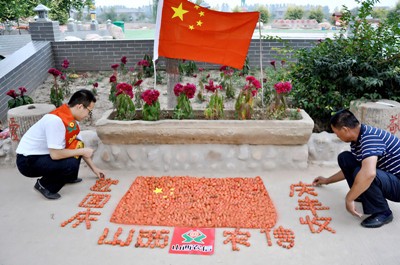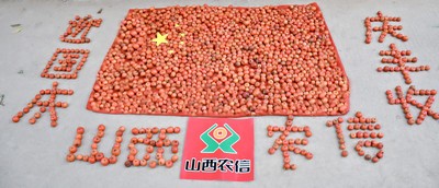 洪洞農(nóng)信社職工正在與果農(nóng)同擺國旗慶國慶