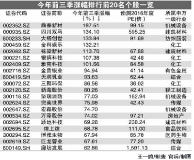 A股的秋季攻勢在國慶長假后似乎已打響,不少個股的走牛,讓市場聞到久違的“牛味”。而今年連創(chuàng)新高的個股更吸引著整個市場的關(guān)注。 據(jù)證券時(shí)報(bào)·e公司記者統(tǒng)計(jì),截至今年9月30日,前三季度深滬兩市共有348只個股創(chuàng)下歷史新高,剔除2015年12月至2016年9月30日上市的次新股后,實(shí)際創(chuàng)新高個股為197家。從行業(yè)分布看,主要集中在汽車、電子、食品飲料、醫(yī)藥生物、農(nóng)林牧漁等領(lǐng)域。 記者發(fā)現(xiàn),隨著A股風(fēng)格向低估值板塊切換,2016年績優(yōu)成長股創(chuàng)新高的家數(shù)趨增。具體來看,在創(chuàng)新高個股中,動態(tài)PE在30倍以內(nèi)的有29只,40倍以下的個股達(dá)到55只。 業(yè)內(nèi)人士認(rèn)為,股價(jià)創(chuàng)新高可謂是個股的“榮耀時(shí)刻”,不但給投資者帶來豐厚回報(bào),也會重新吸引全市場的關(guān)注。這意味著,不管是在2007年的6124點(diǎn)還是去年的5178點(diǎn),投資者在此前任何一個時(shí)點(diǎn)買入持有都會實(shí)現(xiàn)盈利。通過過往案例不難發(fā)現(xiàn),依靠自身踏實(shí)經(jīng)營、因業(yè)績快速增長而走強(qiáng)的績優(yōu)成長股的長期表現(xiàn)不亞于重組股,并可以帶領(lǐng)投資者穿越牛熊周期。 重組股占據(jù)漲幅榜前三 從股價(jià)漲幅來看,今年前三季度漲幅排名前三的個股分別是鼎泰新材(002352)、四川雙馬(000935)、大楊創(chuàng)世(600233),漲幅分別高達(dá)187.51%、134.10%和133.94%。 三者共同之處在于均為重組類、或具備重組預(yù)期的個股。例如,鼎泰新材于今年5月23日公布重組方案,宣布國內(nèi)快遞行業(yè)的航母順豐控股擬作價(jià)433億元實(shí)現(xiàn)借殼上市。其股價(jià)由停牌前4月1日的13.78元,在復(fù)牌后的7月1日升至最高51.15元。 排名第二的四川雙馬雖未實(shí)質(zhì)性重組,但具備相關(guān)重組預(yù)期。公司于8月22日公告稱,其控股股東將發(fā)生變更——四川雙馬原大股東拉法基宣布退出第一大股東地位,擁有IDG背景的和諧恒源實(shí)際控制人林棟梁將成為新的實(shí)際控制人。之后公司披露新股東還提及了擇機(jī)注入資產(chǎn)的可能,即“不排除未來將根據(jù)上市公司的戰(zhàn)略需求和實(shí)際經(jīng)營情況,擇機(jī)注入符合國家產(chǎn)業(yè)發(fā)展方向的優(yōu)質(zhì)資產(chǎn)”。由此,四川雙馬股價(jià)迎來一波爆炒。 大楊創(chuàng)世則在3月22日晚間發(fā)布了圓通速遞擬175億元借殼上市的詳細(xì)預(yù)案。 對此,上海本地某私募人士受訪時(shí)稱,并購重組是A股市場永恒的主題,相關(guān)個股每年都有不俗漲幅。但對普通投資人而言,類似機(jī)會卻可遇不可求。事實(shí)上,2016年個股不乏結(jié)構(gòu)性機(jī)會,除去重組類個股,那些依靠內(nèi)生性增長、依靠業(yè)績驅(qū)動而走強(qiáng)的個股不在少數(shù)。 績優(yōu)成長股崛起 記者統(tǒng)計(jì)發(fā)現(xiàn),今年前三季度漲幅排名前十的公司中,涌現(xiàn)出不少成長股,例如天潤乳業(yè)(600419)和三聚環(huán)保(300072),分別位列第9和第10位,漲幅分別為93.63%和86.56%。 其中,三聚環(huán)保作為近幾年的牛股,對投資者來說并不陌生。回首2012年,公司股價(jià)尚徘徊于3-4元(前復(fù)權(quán))一線,如今搖身一變已成十倍牛股,2016年9月13日最高升至55.46元的歷史新高,截至10月11日,股價(jià)報(bào)收于47.77元。 與股價(jià)相對應(yīng)的是,公司業(yè)績也表現(xiàn)不俗。據(jù)10月10日披露的三季報(bào)預(yù)告顯示,三聚環(huán)保預(yù)計(jì)前三季度實(shí)現(xiàn)凈利潤11.5億元至12.5億元,同比增長96.94%至114.07%。公告稱,業(yè)績增長的原因在于公司繼續(xù)穩(wěn)步推進(jìn)各項(xiàng)業(yè)務(wù),收入較去年同期有較大提升;能源凈化綜合服務(wù)、綜合運(yùn)營增值服務(wù)業(yè)務(wù)收益增長較快。 同樣,天潤乳業(yè)此前曾預(yù)計(jì)2016三季度凈利潤比上年同期大幅增長100%左右;在今年9月30日,公司股價(jià)迎來73.87元的歷史新高。 事實(shí)上,伴隨著A股市場風(fēng)格向低估值板塊切換,2016年績優(yōu)成長類牛股頻出。記者統(tǒng)計(jì)梳理后發(fā)現(xiàn),若按照市場機(jī)構(gòu)近180天對相關(guān)公司每股收益(2016年)一致預(yù)測為基礎(chǔ),把得出的動態(tài)PE作為條件篩選,在創(chuàng)新高個股中,動態(tài)PE在30倍以內(nèi)的個股達(dá)到29只,具體分布在汽車、醫(yī)藥生物、食品飲料、建筑裝飾、農(nóng)林牧漁等傳統(tǒng)領(lǐng)域。 其中,既有被產(chǎn)業(yè)資本頻繁相中的萬科A;還有諸多耳詳能熟的老牌價(jià)值股——貴州茅臺、美的集團(tuán)、東阿阿膠等,這三家公司前三季度漲幅分別為39.06%、25.79%和14.4%。 在研究機(jī)構(gòu)看來,績優(yōu)股或仍是四季度建議配置的方向。興業(yè)證券10月9日發(fā)布策略研報(bào)稱,2016年四季度建議重點(diǎn)配置績優(yōu)股:1、估值與成長性匹配、不斷兌現(xiàn)業(yè)績的績優(yōu)股——家裝產(chǎn)業(yè)鏈、光通信;2、受益于穩(wěn)增長+調(diào)結(jié)構(gòu)的PPP板塊中的建筑、環(huán)保等;3、中期報(bào)告高景氣子行業(yè),如汽車等。 |