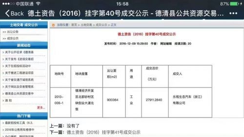 據(jù)證券時(shí)報(bào)e公司報(bào)道,來(lái)自德清縣公共資源交易中心的消息顯示,12月9日下午,該中心成交了一宗土地,出讓面積90.04萬(wàn)平方米,用途為工業(yè),成交價(jià)格2.79億元,成交人為樂(lè)視生態(tài)汽車(浙江)有限公司。