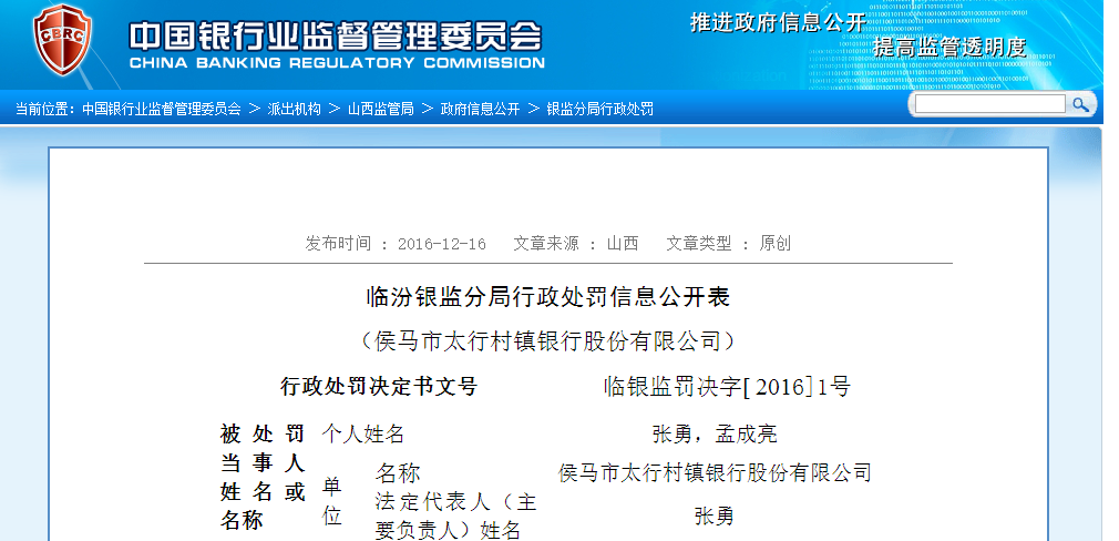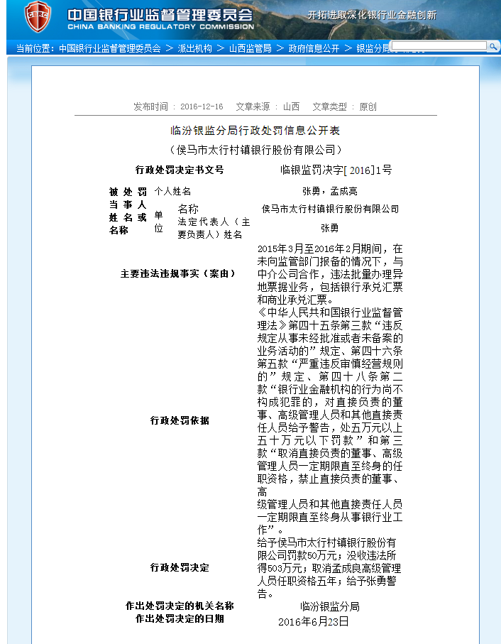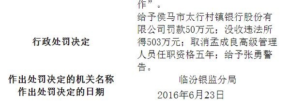 臨汾銀監(jiān)分局給予侯馬市太行村鎮(zhèn)銀行股份有限公司罰款50萬(wàn)元;沒(méi)收違法所得503萬(wàn)元;取消孟成良高級(jí)管理人員任職資格五年;給予張勇警告。 |