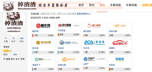 該平臺相關負責人介紹,掉渣渣是中國領先的二手車眾籌投資人交流平臺,提供包括資訊、二手車眾籌平臺導航、車籌學院以及車籌曝光等二手車眾籌平臺信息,為投資人的車籌之路保駕護航。目前活動正在火熱進行中,截止發(fā)稿時,統(tǒng)計到的投票已經(jīng)有412人,而且數(shù)量仍在持續(xù)增加。本次活動也從第三方角度客觀反映出目前二手車眾籌行業(yè)的發(fā)展狀況。 最后,該活動負責人表示,車籌有風險,投資之前還望各位投友三思而后行,理性分析。