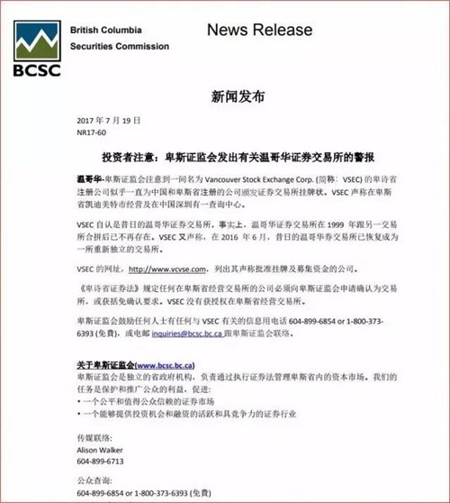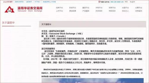 在溫哥華證券交易所(Vancouver Stock Exchange,VSE)于1999年11月29日和加拿大風(fēng)險(xiǎn)投資交易所(Canadian Venture Exchange)合并并最終加入多倫多證券交易所(Toronto Stock Exchange)之后,溫哥華就再也沒有官方認(rèn)證的證券交易所了。但是近日,一個(gè)名為溫哥華證券交易所公司(Vancouver Stock Exchange Corp.,VSEC)的卑詩省注冊(cè)公司出現(xiàn)在公共視野中,卑詩證監(jiān)會(huì)(British Columbia Securities Commission,BCSC)表示,正在調(diào)查該公司。 卑詩證監(jiān)會(huì)調(diào)查“溫哥華證券交易所” 因接到投訴,卑詩證監(jiān)會(huì)正在調(diào)查一個(gè)名為“溫哥華證券交易所公司”的卑詩省注冊(cè)公司,懷疑其在未獲授權(quán)下,為中國(guó)及卑詩省注冊(cè)公司頒發(fā)“證券交易所掛牌證書”。卑詩證監(jiān)會(huì)提醒投資者,投資者理解的溫哥華證券交易所早于18年前已不存在。卑詩證監(jiān)會(huì)特地發(fā)出中文通告鼓勵(lì)人們舉報(bào)。 卑詩證監(jiān)會(huì)昨天發(fā)出的一項(xiàng)聲明中指出,VSEC聲稱在卑詩省西北部基蒂馬特(Kitimat)營(yíng)運(yùn),并且在中國(guó)深圳設(shè)有咨詢中心。VSEC自稱是昔日的溫哥華證券交易所,并且聲稱在1999年并入多倫多證券交易所后,已于2016年6月再次成為一個(gè)獨(dú)立交易所。 根據(jù)卑詩省《證券法》(Securities Act)規(guī)定,任何在卑詩省經(jīng)營(yíng)交易所的公司,必須向BCSC申請(qǐng)確認(rèn)或獲豁免確認(rèn)要求。而VSEC則沒有獲授權(quán)在卑詩省經(jīng)營(yíng)交易所。BCSC呼吁有關(guān)于VSEC資料的任何人士,請(qǐng)即聯(lián)絡(luò)BCSC,電話:604-899-6854,或1-800-373-6393,或電郵至inquiries@bcsc.bc.ca。 卑詩證監(jiān)會(huì)說,這還是第一次調(diào)查有個(gè)人或機(jī)構(gòu)涉嫌假冒證券交易所活動(dòng)。 負(fù)責(zé)人疑似在卑詩小城基蒂馬特開旅館 小編以在中國(guó)大陸做燈具生意想來溫哥華融資為由撥通了“溫哥華證券交易所”在卑詩的電話,接電話是一自稱蔣小姐的女士,她說可以提供協(xié)助,但是具體事宜最好跟“王總”溝通,他目前在中國(guó)國(guó)內(nèi)幫助中國(guó)企業(yè)在溫哥華上市。當(dāng)小編問她,為什么“溫哥華證券交易所”辦公地點(diǎn)卻不在溫哥華的時(shí)候,蔣小姐她稱在加國(guó)生活20多年,了解卑詩林業(yè)和液化天然氣開發(fā)情況,并強(qiáng)調(diào)她居住的基蒂馬特將是液化天然氣輸出中心。 小編隨后致電“王總”,但是加拿大的電話號(hào)碼和中國(guó)的電話號(hào)碼均無人接聽。不過,據(jù)星島日?qǐng)?bào)報(bào)道,自稱“王總”的男子說:幫助在溫哥華上市的收費(fèi)分為4種,最便宜的6萬元人民幣,最貴的要230萬美元,根據(jù)客戶不同需求而定。他在電話中向記者強(qiáng)調(diào),這家溫交所咨詢服務(wù)中心有法律團(tuán)隊(duì)可提供專業(yè)知識(shí),叫記者不用擔(dān)心中加之間不同的金融規(guī)條問題:“凡是過不了我們法律團(tuán)隊(duì)專業(yè)審查的事,我們都不做,所以說,我們安排在溫交所上市程序都是合理合法!苯毁M(fèi)方式可以電匯或當(dāng)面結(jié)賬,還鼓勵(lì)到深圳前海該公司辦事處面洽。 此外,深圳這個(gè)VSEC網(wǎng)頁列出該公司聲稱批準(zhǔn)掛牌以及募集資金的公司案例。卑詩證監(jiān)會(huì)指出,凡在卑詩經(jīng)營(yíng)交易所的公司須向BCSC申請(qǐng)確認(rèn)為交易所,或獲豁免確認(rèn)要求;但這個(gè)“溫哥華證券交易所”并沒獲授權(quán)在卑詩省經(jīng)營(yíng)交易所。事實(shí)上,溫哥華目前沒有一家名叫溫哥華證券交易所的機(jī)構(gòu)在運(yùn)作。 更讓人意外的是,Vancouver Stock Exchange Corp.的北美通訊地址,竟與一家名為“Kitimat Hotel”的小旅館地址一模一樣;記者致電這家Kitimat Hotel時(shí),接電話是同一位蔣小姐,并透露她在15年前購(gòu)下了Kitimat Hotel,現(xiàn)也經(jīng)營(yíng)酒店生意,說該酒店一晚房間費(fèi)用70加元。 “溫哥華證券交易所”起底 根據(jù)“溫哥華證券交易所”網(wǎng)站(http://www.vcvse.com/)的中文介紹,溫交所(VSE)面向全球各個(gè)國(guó)家和地區(qū)的企業(yè),全面接受股權(quán)掛牌和股票上市的申請(qǐng)、審核、頒發(fā)股權(quán)掛牌代碼和股權(quán)掛牌證書。只要進(jìn)到溫交所金融池,北美四大交易所(納斯達(dá)克,紐交所,多交所,溫交所)任意選擇。專業(yè)的海外+國(guó)內(nèi)團(tuán)隊(duì)服務(wù),時(shí)間最快、價(jià)格最省、門檻最低、服務(wù)最周全,咨詢最全面。 該網(wǎng)站介紹說:具有百年歷史的溫交所成立于1906年,初期主要為加拿大西部礦產(chǎn)和石油行業(yè)等計(jì)劃上市企業(yè)籌集上市資金。1999年,為降低金融危機(jī)的壓力,曾把溫交所業(yè)務(wù)并入多倫多證券交易所。按規(guī)模而言,溫交所位列“北美四大證券交易所之一”2016年6月再次獨(dú)立出來。已獲得加拿大政府頒發(fā)牌照和加拿大駐中國(guó)領(lǐng)事館公證。 至于“溫哥華證券交易所”網(wǎng)站列出的“中華人民共和國(guó)駐溫哥華總領(lǐng)事館”發(fā)出的證書,中國(guó)駐溫哥華總領(lǐng)事館人員指,駐溫總領(lǐng)館只對(duì)加拿大官方機(jī)構(gòu)的公證進(jìn)行認(rèn)證,具體規(guī)則及程序在總領(lǐng)館網(wǎng)站都有列明。 企業(yè)介紹措辭不專業