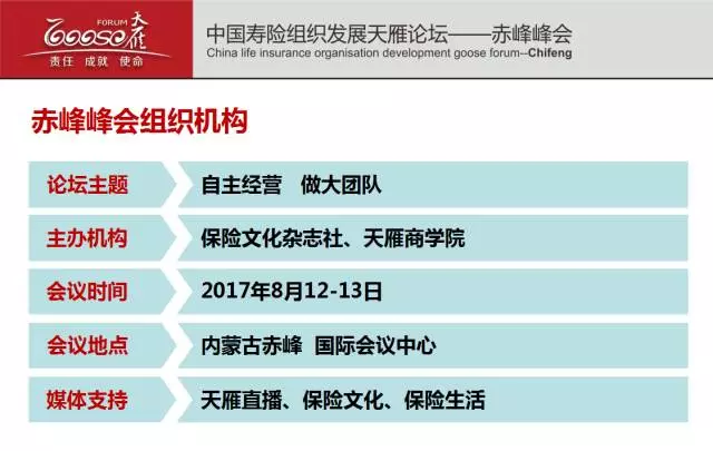 2017年8月12-13日,中國壽險組織發(fā)展天雁論壇赤峰峰會將在內(nèi)蒙古赤峰國際會議中心隆重舉辦。赤峰峰會秉承“壯大壽險營銷隊伍以及增強團(tuán)隊凝聚力、戰(zhàn)斗力、生命力”的信念,幫助眾多學(xué)員學(xué)習(xí)組織發(fā)展、提高業(yè)績能力。