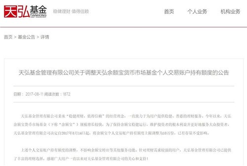 【科技簡(jiǎn)評(píng)8月12日消息】天弘基金昨日在官網(wǎng)發(fā)布公告,稱因天弘余額寶貨幣市場(chǎng)基金(下稱“余額寶”)規(guī)模增長(zhǎng)較快,為了保持余額寶穩(wěn)健運(yùn)行,維護(hù)投資者的根本利益并更好地服務(wù)大眾投資者,天弘基金管理有限公司決定自2017年8月14日起,將余額寶個(gè)人交易賬戶持有額度上限調(diào)整為10萬份,已有存量不受影響。