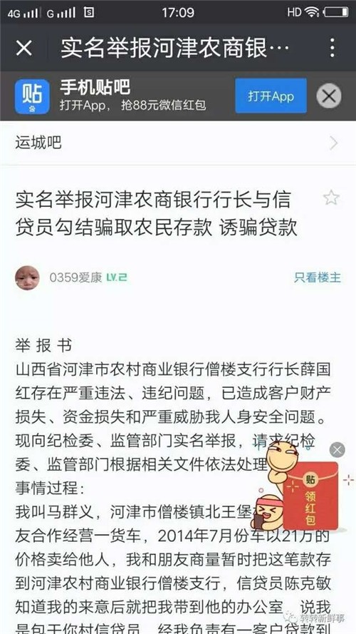 一封來(lái)自山西省運(yùn)城市河津市的舉報(bào)信: 山西省河津市農(nóng)村商業(yè)銀行僧樓支行行長(zhǎng)薛國(guó)紅存在嚴(yán)重違法、違紀(jì)問(wèn)題,已造成客戶財(cái)產(chǎn)損失、資金損失和嚴(yán)重威脅我人身安全問(wèn)題,F(xiàn)向紀(jì)檢委、監(jiān)管部門(mén)實(shí)名舉報(bào),請(qǐng)求紀(jì)檢委、監(jiān)管部門(mén)根據(jù)相關(guān)文件依法處理。 事情過(guò)程: 我叫馬群義,河津市僧樓鎮(zhèn)北王堡村人,與朋友合作經(jīng)營(yíng)一貨車,2014年7月份車以21萬(wàn)的價(jià)格賣給他人,我和朋友商量暫時(shí)把這筆款存到河津農(nóng)村商業(yè)銀行僧樓支行,信貸員陳克敏知道我的來(lái)意后就把我?guī)У剿霓k公室,說(shuō)我是包干你村信貸員,經(jīng)我負(fù)責(zé)有一客戶貸款到期,20萬(wàn)元先讓我用上三到五天, 歸銀行后馬上又能貸出來(lái),每天給你300元利息,因?yàn)槭倾y行工作人員我就相信了,給我出借條是2014年7月12日,五天過(guò)去了我向信貸員陳克敏要我的錢,他說(shuō)款還沒(méi)有辦好還要在等幾天給你多出幾天利息,就這樣一直推辭,我的噩夢(mèng)從此開(kāi)始。 2014年8月中旬,信貸員陳克敏到我妻開(kāi)的河津樊村西衛(wèi)聯(lián)通營(yíng)業(yè)廳以送息為謊,自己需要一部手機(jī)因沒(méi)帶多余錢欠款800元,他說(shuō)我用你的20萬(wàn)暫時(shí)還要用一段時(shí)間,急用錢我給你先貸點(diǎn)款,我妻說(shuō)你把我錢不給我讓我貸款,我沒(méi)有資格貸款。過(guò)了幾天,信貸員陳克敏就通知我說(shuō)沒(méi)有擔(dān)保人也能給你貸款,我和妻來(lái)到了僧樓支行,陳克敏說(shuō)擔(dān)保人已經(jīng)給你找好了,和領(lǐng)導(dǎo)說(shuō)好能貸4.8萬(wàn)元,這筆款貸在你妻名下, 你和擔(dān)保人每人用2.4萬(wàn)元,并說(shuō)擔(dān)保人不認(rèn)識(shí)你,你必須把存折交到我手里,這樣人家才愿意為你擔(dān)保,這個(gè)貸款到期不用你歸銀行我歸銀行。我和妻就把為貸款辦好的存折和密碼交給了信貸員陳克敏。就這樣在信貸員的安排下,我和妻就辦理了貸款手續(xù),陳克敏讓我先回家等通知,等了幾天聯(lián)系他手機(jī)就關(guān)機(jī),到9月9日我到僧樓支行找到信貸員陳克敏,他說(shuō)貸出的款擔(dān)保人急用錢全部取走了,然后就把存折給了我,我查詢才知道,在8月21日4.8萬(wàn)元全部被陳克敏領(lǐng)走,就剩下欠我的手機(jī)款800元(有存折取款證據(jù))。在此期間,我和妻多次找陳克敏要我的借款與貸款,但一直沒(méi)有結(jié)果。 2015年9月29日,僧樓支行工作人員打電話要我妻歸名下貸款,當(dāng)時(shí)信貸員陳克敏與行長(zhǎng)薛國(guó)紅都在銀行,我就問(wèn)信貸員陳克敏我妻名下貸款之事,并向行長(zhǎng)薛國(guó)紅反應(yīng)了當(dāng)時(shí)信貸員陳克敏非法侵占我的存款20萬(wàn)元與我妻名下4.8萬(wàn)元貸款情況,行長(zhǎng)薛國(guó)紅并沒(méi)有問(wèn)及他的員工怎么回事,就讓我寫(xiě)了貸款情況說(shuō)明,陳克敏當(dāng)面就立即表示這筆貸款他歸。行長(zhǎng)薛國(guó)紅就讓信貸員寫(xiě)了還款保證書(shū),歸款期限到2015年11月底。我以為有行長(zhǎng)薛國(guó)紅出面此事就能得到很好的解決,信貸員陳克敏就能得到應(yīng)有的懲處,因?yàn)槲覍?xiě)的貸款情況說(shuō)明與信貸員寫(xiě)給行長(zhǎng)的保證書(shū)薛國(guó)紅都?jí)涸阢y行里(有復(fù)印件證據(jù)),在以后的時(shí)間里僧樓支行沒(méi)有向我妻要過(guò)貸款。 2016年8月1日,接到法院傳票時(shí)我才知道,做為行長(zhǎng)的薛國(guó)紅并沒(méi)有處理非法侵占客戶存款與貸款的信貸員陳克敏,而把沒(méi)有拿到貸款的我妻張孟珍起訴到法院。2016年11月15日法院開(kāi)庭,當(dāng)我看到行長(zhǎng)薛國(guó)紅的起訴書(shū)時(shí)我很震驚,竟然在貸款資料中把我妻身份證號(hào)與住址變成擔(dān)保人的身份證號(hào)及住址。因擔(dān)保人是行長(zhǎng)薛國(guó)紅的朋友不說(shuō)實(shí)情給法庭做了偽證,法院不讓我代表我妻出庭做證,提交的實(shí)情材料也石沉大海,判決我妻歸還名下貸款4.8萬(wàn)元。 2016年12月13日擔(dān)保人帶其他人打傷我(有住院證明),砸了我聯(lián)通營(yíng)業(yè)廳電腦一部(有監(jiān)控證據(jù)),強(qiáng)迫讓我給她打收款條威脅我,多次帶人到營(yíng)業(yè)廳鬧事, 2017年2月20日擔(dān)保人拿著強(qiáng)迫讓我給她打的收款條,把我夫妻倆告上法院起訴給我要錢、讓我歸銀行貸款,我不明白為什么法院已開(kāi)庭沒(méi)有做出判決?通知我說(shuō)擔(dān)保人扯訴了?以上事實(shí)證明行長(zhǎng)薛國(guó)紅在幕后操縱。 2017年6月6日僧樓支行的工作人員帶法院的人到河津樊村西衛(wèi)聯(lián)通營(yíng)業(yè)廳逮捕我妻打恐嚇電話。致使我夫妻現(xiàn)在已無(wú)路可走。 僧樓支行行長(zhǎng)薛國(guó)紅(現(xiàn)升任河津市農(nóng)村商業(yè)銀行東城支行行長(zhǎng))、信貸員陳克敏(現(xiàn)已去向不明)的違紀(jì)、違法行為,給我夫妻倆造成嚴(yán)重的身心傷害和慘重的經(jīng)濟(jì)損失,在我夫妻已走投無(wú)路情況下選擇了正確的舉報(bào)維權(quán)。 通過(guò)學(xué)習(xí)相關(guān)銀行管理文件我認(rèn)為僧樓支行信貸員截留我的存款與貸款是違法事件,目前造成了我的人身安全與財(c