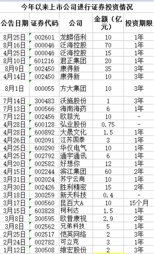 半年報(bào)數(shù)據(jù)顯示,上半年,有490家上市公司征戰(zhàn)股市,初始投資金額高達(dá)1252.45億元!“炒股”不但讓海螺水泥狂賺18.6億元一戰(zhàn)封神,還讓蘭州黃河扭虧為盈,桂東電力上半年通過“打新”中了68只新股,成為名副其實(shí)的“打新王”,上港集團(tuán)初始投資金額更是高達(dá)141.5億元(當(dāng)然,138.65億元是去年參與郵儲銀行IPO認(rèn)購的該行H股)…… 從已經(jīng)公布完畢的A股上市公司2017年半年報(bào)來看,今年上半年,共有490家上市公司持有其他上市公司股票,相比2016年年底增加了83家;初始投資金額1252.45億元,相比2016年年底減少了176.05億元。今年上半年,由于A股行情總體向好,一方面,入市新軍大幅增加,另一方面,不少上市公司趁機(jī)高位套現(xiàn)。 其中,投資金額最高的為上港集團(tuán)。半年報(bào)顯示,上港集團(tuán)共持有招商銀行、交通銀行、豐華股份、申萬宏源4家A股公司和郵儲銀行1家H股公司的股份,初始投資成本高達(dá)141.5億元,其中,由于上港集團(tuán)去年作為基石投資者參與郵儲銀行H股IPO,僅郵儲銀行一家公司的初始投資成本就高達(dá)138.65億元。 上港集團(tuán)持股明細(xì) 數(shù)據(jù)來源:東方財(cái)富Choice 投資股票數(shù)量最多的則是桂東電力。雖然總投資金額不大,單只股票的投資金額大多數(shù)也只有幾千元而已,但由于愛好“打新”,桂東電力僅上半年就中簽68只新股,因此在手股票的數(shù)量高達(dá)83只。桂東電力在半年報(bào)中表示,除國海證券為原先持有,廣汽集團(tuán)、納川股份、寧波精達(dá)、網(wǎng)達(dá)軟件股票為公司自籌資金從二級市場買入外,其余均為公司通過新股申購中簽買入。 數(shù)據(jù)來源:東方財(cái)富Choice 從會(huì)計(jì)處理來看,不少上市公司將股票投資計(jì)入了“交易性金融資產(chǎn)”,更多的上市公司則計(jì)入了“可供出售金融資產(chǎn)”或“長期股權(quán)投資”科目。 “‘交易性金融資產(chǎn)’以短期持有為目的,‘可供出售金融資產(chǎn)’和‘長期股權(quán)投資’則是長期持有!北本┮淮笮蜁(huì)計(jì)師師事務(wù)所人士對中國證券報(bào)(ID:xhszzb)記者表示。 值得注意的是,今年以來,上市公司大舉買入甚至“舉牌”同行業(yè)上市公司的案例多發(fā),包括長江電力及其一致行動(dòng)人斥資逾23億元舉牌國投電力,大北農(nóng)舉牌荃銀高科并逼近第二次舉牌線,等等。另外,今年7月,永輝超市舉牌中百集團(tuán),而這已經(jīng)是永輝超市三年多來第五次舉牌中百集團(tuán)。 在上市公司大舉進(jìn)軍股市的情況下,“炒股”成績已經(jīng)成為業(yè)績的“雙刃劍”。很多公司由于“炒股”收益大幅增厚了公司業(yè)績。還是以海螺水泥為例,在股市狂賺18.6億的情況下,公司上半年的業(yè)績達(dá)到了67.17億元。從過往來看,穩(wěn)定的股票投資收益甚至已經(jīng)成為了海螺水泥一項(xiàng)重要的盈利手段。 同時(shí),海螺水泥“炒股”是建立在穩(wěn)定的主業(yè)基礎(chǔ)上的。實(shí)際上,海螺水泥不但“炒股”成績第一,水泥主業(yè)成績也是第一,這也使海螺水泥能夠從容地長期持有手中股票,通過“高拋低吸”立于不敗之地。而且,數(shù)年來,海螺水泥只買賣同行業(yè)上市公司股票,價(jià)值投資和戰(zhàn)略投資的意圖非常明確。 相反,很多上市公司在主業(yè)不振的情況下,則以“炒股”為生。以蘭州黃河為例,在主業(yè)虧損的情況下,依靠手中的22只股票,公司最終實(shí)現(xiàn)凈利潤707.71萬元。早在半年報(bào)業(yè)績預(yù)告中,蘭州黃河表示,報(bào)告期內(nèi),國內(nèi)證券市場逐步企穩(wěn)向好,公司證券投資處置及持有收益較上年同期有較大幅度增長,導(dǎo)致公司在本報(bào)告期扭虧為盈。 不過,成也蕭何,敗也蕭何。由于蘭州黃河長期以“炒股”為生,“炒股”的成績也就約等于公司業(yè)績,一旦股市行情不好,公司的業(yè)績也就很可能因此被墜入深淵。2016年,公司虧損2509.36萬元。對此,公司直言,“證券投資虧損是造成公司報(bào)告期出現(xiàn)虧損的主要原因,由于證券市場持續(xù)低迷,公司的證券投資賬面虧損2146萬元! “以‘炒股’為生不是長久之計(jì)。一方面,公司業(yè)績主要來自于‘炒股’成績的話,公司的業(yè)績波動(dòng)會(huì)非常大;另一方面,這樣的公司一般都把股票投資計(jì)入‘交易性金融資產(chǎn)’,股市和股票價(jià)格的波動(dòng)會(huì)直接影響當(dāng)期損益,進(jìn)一步加大公司業(yè)績的波動(dòng)!鄙鲜鰰(huì)計(jì)師事務(wù)所人士告訴中國證券報(bào)(ID:xhszzb)記者。 今年以來,上市公司入市熱情有增無減。除了已經(jīng)于股市沉浮的上市公司,據(jù)中國證券報(bào)(ID:xhszzb)記者不完全統(tǒng)計(jì),今年上半年,又有27家上市公司發(fā)布擬使用自有資金、閑置募集資金或通過融資的方式進(jìn)行證券投資的公告,擬投入資金總額共計(jì)332.05億元,可見上市公司入市熱情至高。 數(shù)據(jù)來源:東方財(cái)富Choice 以泛?毓蔀槔,在今年4月授權(quán)全資子公司泛海股權(quán)投資公司使用總額不超過15億元進(jìn)行證券投資后,今年8月,泛?毓捎职咽跈(quán)給境外全資子公司泛海國際股權(quán)投資進(jìn)行證券投資的額度由不超過35億元(其中,融資規(guī)模不超過17.5億元)調(diào