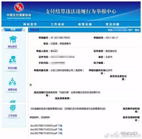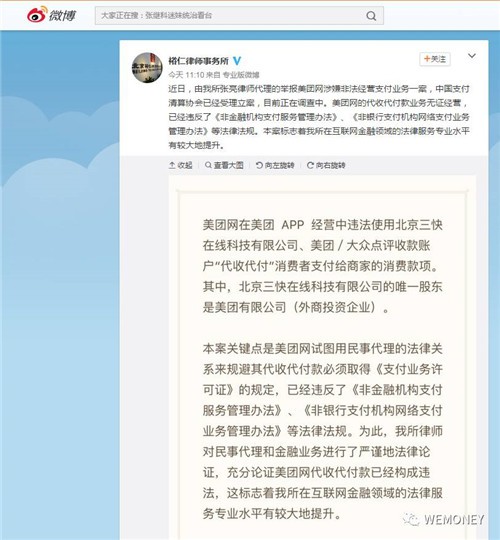 8月30日,微博實(shí)名認(rèn)證的@北京裕仁律師事務(wù)所發(fā)布微博稱(chēng),已向中國(guó)支付清算協(xié)會(huì)實(shí)名舉報(bào),美團(tuán)“代收付款”業(yè)務(wù)涉嫌無(wú)證非法經(jīng)營(yíng)。據(jù)了解,目前中國(guó)支付清算協(xié)會(huì)官網(wǎng)顯示舉報(bào)已經(jīng)受理,正在調(diào)查中。 中國(guó)支付清算協(xié)會(huì)官網(wǎng)顯示已受理該舉報(bào),并在舉報(bào)調(diào)查中(圖片來(lái)源:裕仁律師事務(wù)所微博) 根據(jù)舉報(bào)材料中的交易記錄及美團(tuán)網(wǎng)《商戶服務(wù)協(xié)議》,用戶通過(guò)美團(tuán)網(wǎng)購(gòu)買(mǎi)商家的產(chǎn)品后本應(yīng)支付給商家的款項(xiàng)由美團(tuán)點(diǎn)評(píng)及其關(guān)聯(lián)公司“北京三快在線科技有限公司”(下稱(chēng)“三快在線”)截取,并在沉淀一段時(shí)間后結(jié)算、支付給商家。 裕仁律師事務(wù)所方面提供舉報(bào)材料。舉報(bào)材料中指出,根據(jù)美團(tuán)網(wǎng)“代收付款”業(yè)務(wù)模式,美團(tuán)網(wǎng)采取大商戶結(jié)算模式,即消費(fèi)者支付資金先劃轉(zhuǎn)至美團(tuán)點(diǎn)評(píng)或第三方三快在線公司,再由美團(tuán)點(diǎn)評(píng)或第三方三快在線公司結(jié)算給美團(tuán)網(wǎng)的平臺(tái)商戶。 美團(tuán)的交易記錄顯示,用戶的交易款是由美團(tuán)的注冊(cè)公司三快在線代為收取(圖片來(lái)源:裕仁律師事務(wù)所微博) 同時(shí),美團(tuán)網(wǎng)消費(fèi)者采用微信或支付寶支付消費(fèi)金額時(shí),美團(tuán)網(wǎng)以美團(tuán)網(wǎng)平臺(tái)對(duì)接微信或支付寶等支付機(jī)構(gòu),截留美團(tuán)網(wǎng)商戶結(jié)算資金,然后扣除美團(tuán)網(wǎng)的成本費(fèi)用(服務(wù)費(fèi))后再與商戶結(jié)算。然而,美團(tuán)點(diǎn)評(píng)并未取得金融支付業(yè)務(wù)的許可牌照。 據(jù)此,本案代理律師裕仁律師事務(wù)所張亮認(rèn)為,根據(jù)《非金融機(jī)構(gòu)支付服務(wù)管理辦法》、《非銀行支付機(jī)構(gòu)網(wǎng)絡(luò)支付業(yè)務(wù)管理辦法》等法律法規(guī),美團(tuán)網(wǎng)“代收付款”業(yè)務(wù)的行為,涉嫌無(wú)證經(jīng)營(yíng)支付業(yè)務(wù)的第一類(lèi)無(wú)證經(jīng)營(yíng)銀行卡收單核心業(yè)務(wù)和第二類(lèi)無(wú)證經(jīng)營(yíng)網(wǎng)絡(luò)支付業(yè)務(wù),已構(gòu)成非法經(jīng)營(yíng)行為。 張亮告訴記著,美團(tuán)此舉相當(dāng)于把給商戶的備付金和自己的資金混同,存在巨大的金融風(fēng)險(xiǎn)。 針對(duì)裕仁律師事務(wù)所的舉報(bào),鳳凰WEMONEY聯(lián)系到美團(tuán)點(diǎn)評(píng)相關(guān)負(fù)責(zé)人。對(duì)方表示,2016年9月,已完成對(duì)第三方支付公司錢(qián)袋寶的全資收購(gòu),獲得第三方支付牌照。從去年9月至今,美團(tuán)點(diǎn)評(píng)已經(jīng)完成了與錢(qián)袋寶的系統(tǒng)整合。 值得注意的是,去年,美團(tuán)因違反《非金融機(jī)構(gòu)支付服務(wù)管理辦法》,在沒(méi)有第三方支付牌照的情況下從事第三方支付結(jié)算業(yè)務(wù),被媒體曝光。事后,央行約談并叫停了美團(tuán)支付,美團(tuán)錢(qián)包的充值功能下線。 業(yè)內(nèi)人士指出,去年媒體報(bào)道的焦點(diǎn)是美團(tuán)無(wú)證經(jīng)營(yíng)支付業(yè)務(wù)中的“開(kāi)立類(lèi)支付賬戶的電子錢(qián)包,具有充值、消費(fèi)、提現(xiàn)等支付功能”這一違規(guī)行為。但對(duì)“代收代付”,即做大商戶結(jié)算這一違規(guī)行為并沒(méi)有處理。 此后,美團(tuán)點(diǎn)評(píng)全資收購(gòu)第三方支付公司錢(qián)袋寶,曲線獲得第三方支付牌照。 張亮表示,按照法規(guī)規(guī)定,美團(tuán)支付想要合規(guī)有兩種方式:一是以美團(tuán)為主體去申請(qǐng)第三方支付牌照,這樣用三快在線作為收款方是合規(guī)的。二是為美團(tuán)用戶開(kāi)設(shè)錢(qián)袋寶賬戶,所有收付款全部切換為錢(qián)袋寶收款!澳壳翱磥(lái),美團(tuán)收購(gòu)的錢(qián)袋寶成了擺設(shè),仍然沒(méi)有解決美團(tuán)支付違規(guī)經(jīng)營(yíng)的問(wèn)題!睆埩琳f(shuō)。 |