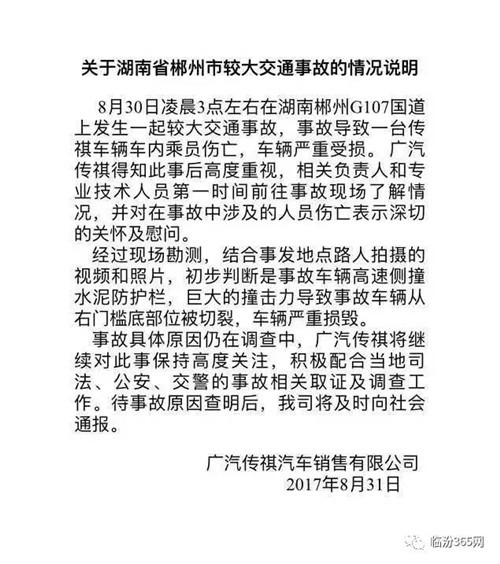 8月30 日凌晨3點(diǎn)左右,湖南郴州G107 國(guó)道上發(fā)生一起嚴(yán)重交通事故。男子王某駕駛一輛廣汽傳祺 GS4 小型汽車側(cè)撞水泥防護(hù)欄,造成乘車 3 人死亡,王某本人受傷。 就這事故本身而言,似乎并沒(méi)有什么特別的地方。全國(guó)各地每天都會(huì)發(fā)生不同的交通事故,有死傷者自然在所難免。 但是看到事故現(xiàn)場(chǎng)圖片的那一刻我驚呆了! 你們感受一下: 車頭中網(wǎng)完整,說(shuō)明沒(méi)有發(fā)生過(guò)正面撞擊; 斷開(kāi)的半截車身 車尾 可以肯定的是這一次撞擊水泥防護(hù)欄確實(shí)超出了GS4的車身承受能力,車身撕裂由底盤開(kāi)始,隨后傳遞到B柱和C柱,最后直接導(dǎo)致車身斷成兩截,而天窗沒(méi)有破碎,行李架沒(méi)形變,車頂基本保持完整說(shuō)明這輛車并沒(méi)有發(fā)生翻滾,同時(shí)這樣的撞擊力度也讓GS4觸發(fā)了安全氣囊和側(cè)氣簾,但確實(shí)這樣的撞擊下顯得有些無(wú)濟(jì)于事,我們通過(guò)現(xiàn)場(chǎng)的圖片也無(wú)法判斷乘客是否系上了安全帶。 關(guān)于車身為什么會(huì)斷成兩截這個(gè)問(wèn)題,網(wǎng)上早已經(jīng)有很多汽車界的「福爾摩斯」給出了自己的看法?偨Y(jié)起來(lái)無(wú)非就是兩個(gè): 1.車速過(guò)快,操作不當(dāng)導(dǎo)致車身側(cè)面受到非常猛烈的沖撞,巨大外力作用導(dǎo)致車身斷裂。 2.車身設(shè)計(jì)存在缺陷,傳祺 GS4 存在小平臺(tái)大車身的嫌疑,車體剛性不足導(dǎo)致發(fā)生斷裂。 事發(fā)一天后,廣汽傳祺官方也在今天下午給出了回應(yīng)。確認(rèn)了事故車輛是從右門檻底部被切裂,造成車身兩截分離。但事故具體原因,還有待進(jìn)一步調(diào)查和分析。 附圖(關(guān)于本次車禍的官方說(shuō)明): |