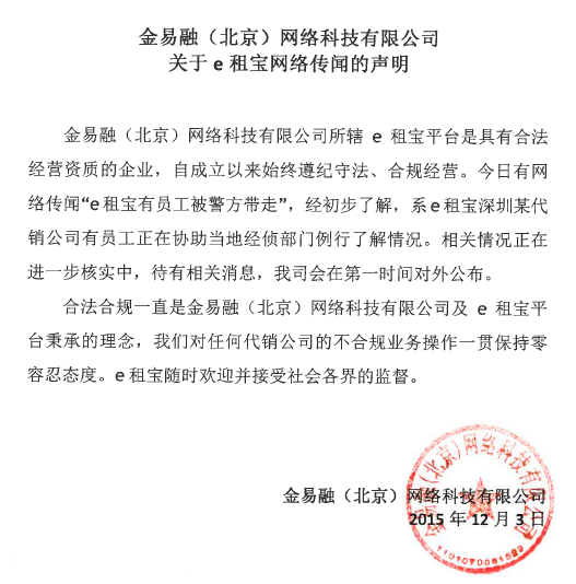 12月3日,據(jù)金融服務(wù)企業(yè)盈燦集團(tuán)旗下網(wǎng)貸之家消息,e租寶深圳分公司今天被經(jīng)偵部門突查。據(jù)悉,該公司疑涉嫌非法吸收公眾存款、存在自融等問題,40余人被警方帶走調(diào)查。e租寶回應(yīng)稱,系深圳代銷公司員工協(xié)助調(diào)查。e租寶是以融資租賃債權(quán)交易為基礎(chǔ)的互聯(lián)網(wǎng)金融撮合服務(wù)平臺(tái),注冊資本金1億元人民幣,總部位于北京。 e租寶曾登陸央視《新聞聯(lián)播》前黃金廣告時(shí)段,并贊助多個(gè)衛(wèi)視節(jié)目,且在今年推了大量線下廣告。據(jù)e租寶官網(wǎng)資料顯示,截至2015年12月2日,平臺(tái)累計(jì)成交額達(dá)726億。 據(jù)盈燦咨詢統(tǒng)計(jì),2015年10月份,共有309個(gè)借款公司在e租寶平臺(tái)上發(fā)布借款標(biāo),借款標(biāo)共計(jì)649個(gè),平均每個(gè)借款公司2.1個(gè)借款標(biāo)。 此外,盈燦咨詢發(fā)現(xiàn),上述借款公司中有292家企業(yè)在借款之前發(fā)生過注冊資本變更,占比達(dá)94.5%。且其注冊資本變更,距發(fā)布第一個(gè)借款標(biāo)的時(shí)間平均為33天。變更前,這些企業(yè)的注冊資本平均為154萬,變更后達(dá)2714萬。 另據(jù)統(tǒng)計(jì),有302家公司在借款之前發(fā)生過法定代表人變更,占比達(dá)97.7%。變更后,有32人在2家以上的借款公司中任法定代表人,即一人控制兩到三個(gè)公司。 e租寶自今年下半年以來存在種種傳聞,北京商報(bào)曾報(bào)道稱e租寶確實(shí)存在內(nèi)控不嚴(yán)、虛假標(biāo)的、自融嫌疑等問題;也有網(wǎng)友通過不同渠道爆料稱e租寶涉嫌傳銷,此次針對“e租寶深圳員工被帶走”傳聞,e租寶公司首次正面回應(yīng)。 關(guān)于e租寶網(wǎng)絡(luò)傳聞的聲明如下: 金易融(北京)網(wǎng)絡(luò)科技有限公司關(guān)于e租寶網(wǎng)絡(luò)傳聞的聲明 金易融(北京)網(wǎng)絡(luò)科技有限公司所轄e租寶平臺(tái)是具有合法經(jīng)營資質(zhì)的企業(yè),自成立以來始終遵紀(jì)守法,合規(guī)經(jīng)營。今日有網(wǎng)絡(luò)傳聞“e租寶有員工被警方帶走”,經(jīng)初步了解,系e租寶深圳某代銷公司有員工正在協(xié)助當(dāng)?shù)亟?jīng)偵部門例行了解情況。相關(guān)情況正在進(jìn)一步核實(shí)中,待有關(guān)消息,我司會(huì)在第一時(shí)間對外公布。 合法合規(guī)一直是金易融(北京)網(wǎng)絡(luò)科技有限公司及e租寶平臺(tái)秉承的理念,我們對任何代銷公司的不合規(guī)業(yè)務(wù)操作一貫保持零容忍態(tài)度。e租寶隨時(shí)歡迎并接受社會(huì)各界的監(jiān)督。 金易融(北京)網(wǎng)絡(luò)科技有限公司 12月3日 |