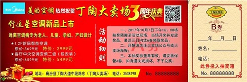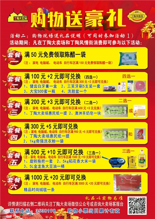 丁陶大賣場(chǎng)在開業(yè)三周年之際傾情回饋消費(fèi)者,2017年9月23日-10月7日在丁陶大賣場(chǎng)、丁陶風(fēng)情街購物或消費(fèi)均可按活動(dòng)規(guī)則兌換抽獎(jiǎng)券,具體規(guī)則如下: 活動(dòng)一:購物滿100元送獎(jiǎng)券(可同時(shí)參加活動(dòng)二) A、獎(jiǎng)券兌換規(guī)則: 在大賣場(chǎng)、風(fēng)情街消費(fèi)或購物累計(jì)滿100元可持購物小票兌換抽獎(jiǎng)券一張; B、抽獎(jiǎng)券使用說明: 獲得抽獎(jiǎng)券的顧客請(qǐng)?jiān)贐券填寫好自己的姓名、電話和消費(fèi)時(shí)間,并把填寫好的B券撕下來放入抽獎(jiǎng)箱,10月7日下午16點(diǎn)整開始抽獎(jiǎng),中獎(jiǎng)?lì)櫩蛻{A券領(lǐng)取獎(jiǎng)品。 C、抽獎(jiǎng)活動(dòng)說明: 抽獎(jiǎng)時(shí)間:2017年10月7日下午16:00 特等獎(jiǎng)1名 大眾汽車一輛 一等獎(jiǎng)2名 比亞迪汽車各一輛 二等獎(jiǎng)50名 山地自行車各一輛 三等獎(jiǎng)300名 精品太空被各一套 活動(dòng)二:購物送豪禮(可同時(shí)參加活動(dòng)一) 抽獎(jiǎng)地點(diǎn):丁陶風(fēng)情街南廣場(chǎng) |
