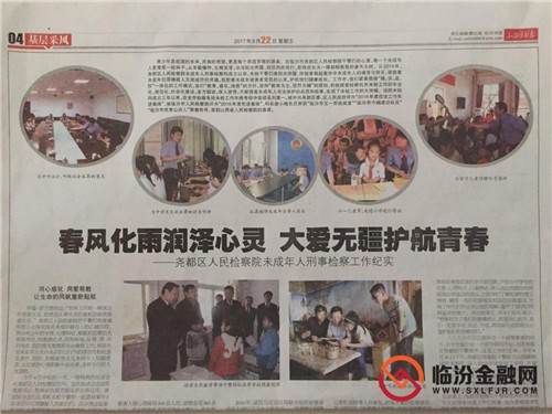 臨汾金融網(wǎng)訊(楊杰) 2017年9月22日出版的《山西法制報》第四版,以“春風化雨潤澤心靈 大愛無疆護航青春”為題整版,報道了堯都區(qū)人民檢察院未成年人刑事檢察工作。 院黨組高度重視未檢工作,黨組書記、檢察長仇振芳同志強調(diào):“做好未成年人的司法保護和犯罪預防工作,關系到未成年人的健康成長和千萬家庭的幸福安寧,關系到社會和諧穩(wěn)定和國家民族未來,這不僅是檢察機關的一項重要職能,也是全社會的共同責任。要牢記職責和使命,持續(xù)聚焦涉罪未成年人的教育、感化、挽救工作,積極救助保護未成年被害人,探索預防未成年人犯罪的工作方法,勇于實踐,打造一支專業(yè)化、規(guī)范化的未檢工作團隊,爭創(chuàng)未成年人檢察工作品牌,為切實保障未成年人健康成長作出更大貢獻! 按照工作職能,未檢科緊緊圍繞“捕、訴、監(jiān)、防”一體化的工作模式,實行“教育、感化、挽救”的方針,堅持“教育為主、懲罰為輔”的原則,積極探索檢察機關未檢工作的專業(yè)化、規(guī)范化、社會化建設,多方聯(lián)動,深入宣傳,不斷提高未成年人司法保護的品質(zhì)和效果,實現(xiàn)了未檢工作的大突破。 將心理疏導引入到未檢工作的每個階段。未檢科成立以來,共受理未成年人刑事案件252起608人,對未成年犯罪嫌疑人及未成年被害人做心理疏導300余人次,親情會見360余人次。 構建未成年人教育的多元化機制。多次與失足未成年人家庭、學校一起,共同建立幫扶體系。同時多方聯(lián)動,充分發(fā)揮教育、婦聯(lián)、團委、學校、社區(qū)、政法各部門的力量,構建多元化未成年人幫教機制。 堅決維護未成年人合法權益。侵害未成年人權益案件嚴重影響了被害人的健康成長,在貫徹最高人民檢察院《關于未成年人刑事檢察工作指引》工作中,將打擊侵害未成年人的犯罪,保護未成年人的合法權益作為工作中的重中之重。 構筑預防未成年人犯罪的防范體系。他們主動服務,多次深入校園開展“法治進校園”宣傳教育活動,提高學生們的法律意識,充分調(diào)動廣大學生、校園和家長積極參與到保護自身合法權益、預防未成年人犯罪活動中來。 扶貧助困,共筑文明社會。多次組織干警進行捐款捐物“獻愛心”活動,為困難家庭未成年人送去檢察干警的人文關懷和博愛之心。2017年端午節(jié),仇振芳檢察長帶領干警看望了土門鎮(zhèn)坡頭村孤兒李慧敏、李成鵬姐弟二人,向他們送去溫暖和祝福。 未檢科成立三年以來,在全市檢察系統(tǒng)未檢工作年終考核中連續(xù)名列第一,被中共堯都區(qū)委、區(qū)人民政府評為“2016年度政法工作先進集體”,被臨汾市人民檢察院評為“2016年度先進集體”。 |