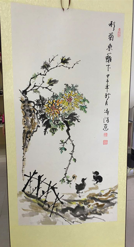 今日拍品:《秋菊東籬下》 類型:花鳥 作者:董澤慧 尺寸: 四尺整張 規(guī)格138*69
