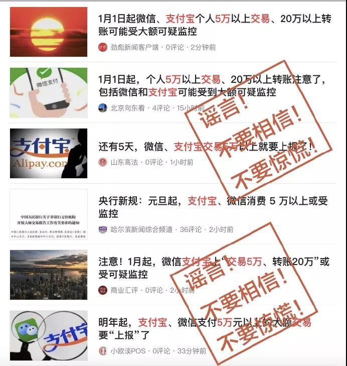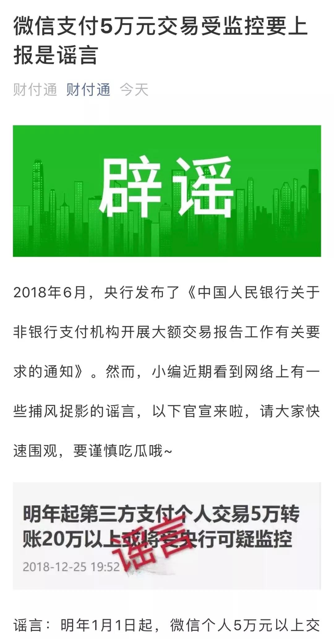 近日,一則“1月起第三方支付個人交易5萬、轉(zhuǎn)賬20萬以上或受監(jiān)控”的消息在市場流傳。對此,支付寶、騰訊財付通相繼發(fā)布消息稱,此信息為謠言。 謠言出處 2018年6月26日,央行發(fā)布了《中國人民銀行關(guān)于非銀行支付機(jī)構(gòu)開展大額交易報告工作有關(guān)要求的通知》(銀發(fā)〔2018〕163號)。