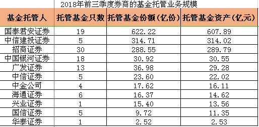 ![]() 從統(tǒng)計數(shù)據(jù)來看,11家券商合計托管的基金資產(chǎn)規(guī)模還不及中國郵政儲蓄銀行一家。不過盡管如此,券商托管業(yè)務(wù)的頭部效應(yīng)還是比較明顯。 據(jù)Wind資訊統(tǒng)計,截至2018年9月30日,在所有券商中,托管基金資產(chǎn)規(guī)模排名前5名的券商分別為國泰君安、中信建投、招商證券、中國銀河、廣發(fā)證券,其托管基金資產(chǎn)規(guī)模分別為607.89億元、314.02億元、289.79億元、30.55億元、29.28億元。而2017年,托管基金資產(chǎn)規(guī)模排名前5名的券商仍然是這5家。
