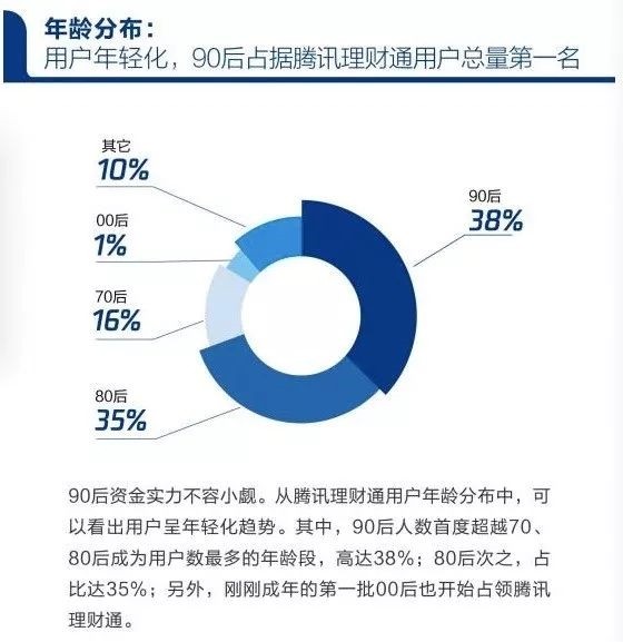 ![]() 看完天弘指數基金大數據,再來看《騰訊理財通五周年大數據》,90后再度成為最活躍的群體。從理財通用戶年齡分布上來看,90后占據騰訊理財通用戶總量第一名,達38%;80后次之,占比達35%;00后占1%。