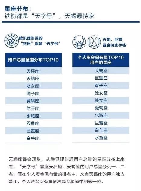 有趣的是,十二星座中,天蝎座最持家(天蝎座的請轉發(fā))。 從騰訊理財通用戶總量的星座分布上來看,天秤座、天蝎座的用戶總量分別位居前兩名。從個人資金保有量排名來看,天蝎座占據第一,成為存錢小能手。金牛座在用戶總量中僅排名第10,個人資金保有量排名中竟然落榜!