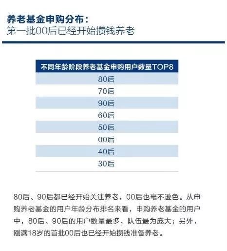 剛滿18歲的第一批00后不僅開始承擔生活重任,還已經開始攢錢準備養(yǎng)老了! 從不同年齡階段養(yǎng)老基金申購用戶數量排名來看,80后、70后、90后的用戶數量最多,而00后也毫不遜色,也加入攢錢養(yǎng)老大軍。