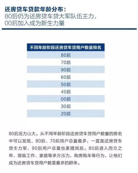 在生活面前,80后、70后、90后都壓力山大,而第一批00后也已經開始還房貸、車貸,甚至準備養(yǎng)老了! 騰訊理財通不同年齡階段還房貸車貸用戶數量的排名顯示,80后、70后用戶總量最多,一直是還房貸車貸的主力;90后緊隨其后;00后加入成為新生力量。