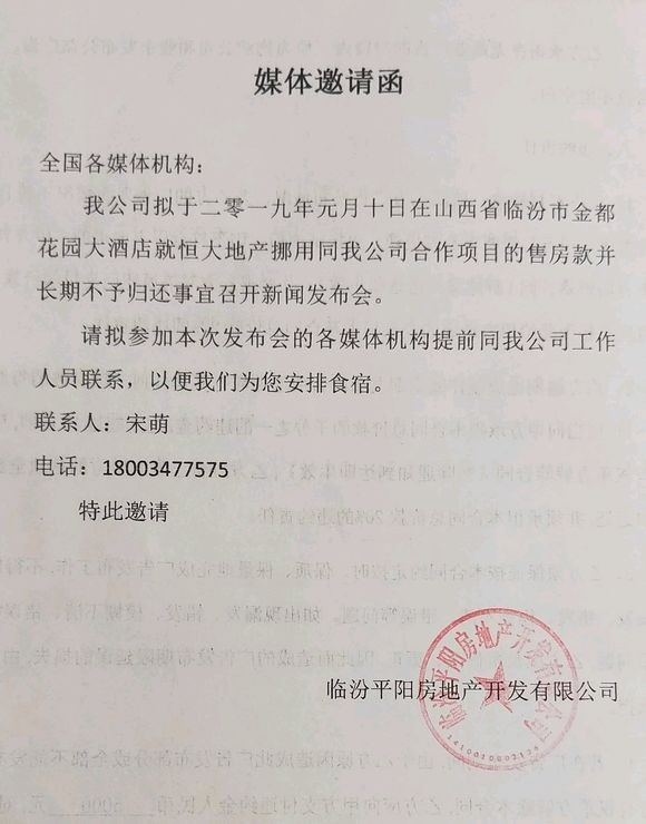 時(shí)至今日,依舊可以從文中,感受到當(dāng)時(shí)臨汾平陽(yáng)地產(chǎn)對(duì)恒大地產(chǎn)挪用巨額售房款一事及其在處理此事的態(tài)度的憤怒。當(dāng)時(shí)立即引發(fā)了多家媒體和公眾的高度關(guān)注,掀起了一陣輿論熱潮。 在事件得不到有效解決的情況下,平陽(yáng)地產(chǎn)發(fā)布了《媒體邀請(qǐng)函》,如下: