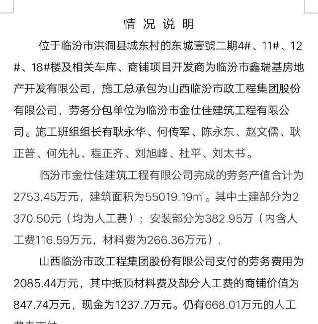 近日,臨汾市金仕佳建筑有限責(zé)任公司(以下簡稱:臨汾金仕佳公司)反映山西臨汾市政工程集團股份有限公司(以下簡稱:臨汾市政集團)拖欠他們668.01萬元的農(nóng)民工工資遲遲不給支付。 據(jù)臨汾金仕佳公司反映,位于臨汾市洪洞縣城東村的東城壹號二期4#、11#、12#、18#樓及相關(guān)車庫、商鋪項目由臨汾市鑫瑞基房地產(chǎn)開發(fā)有限公司負責(zé)開發(fā),施工總承包為臨汾市政集團,勞務(wù)分包單位為臨汾市金仕佳公司(施工班組組長有耿永華、何傳軍、陳永東、趙文儒、耿正普、何先禮、程正齊、劉旭峰、杜平、劉太書)。 據(jù)悉,臨汾金仕佳公司在該項目承建的面積為55019.19㎡,共完成勞務(wù)產(chǎn)值合計2753.45萬元;其中土建部分的人工費為2370.50元;安裝部分為382.95萬(內(nèi)含人工費116.59萬元,材料費為266.36萬元);臨汾市政集團給臨汾市金仕佳公司支付的勞務(wù)費用為2085.44萬元,(其中抵頂材料費及部分人工費的商鋪價值為847.74萬元,現(xiàn)金為1237.7萬元)。截止目前,臨汾市政集團還拖欠臨汾金仕佳公司668.01萬元的人工費尚未支付。 |