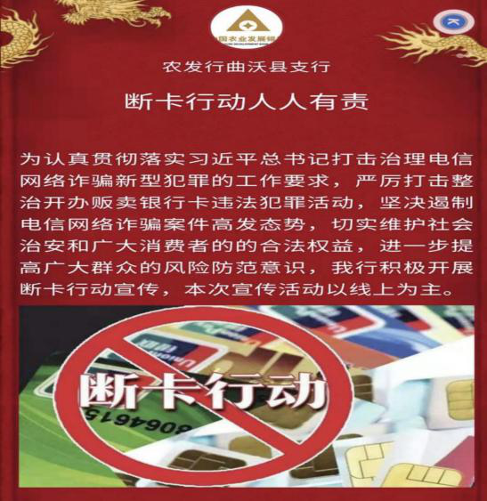 臨汾金融網(wǎng)訊(段文杰)為認真貫徹落實打擊治理電信網(wǎng)絡(luò)詐騙新型犯罪的工作要求,嚴厲打擊整治開辦販賣銀行卡違法犯罪活動,堅決遏制電信網(wǎng)絡(luò)詐騙案件高發(fā)態(tài)勢,切實維護社會治安和廣大消費者的的合法權(quán)益,進一步提高廣大群眾的風險防范意識,農(nóng)發(fā)行曲沃縣支行積極開展斷卡行動宣傳,本次宣傳活動以線上為主。