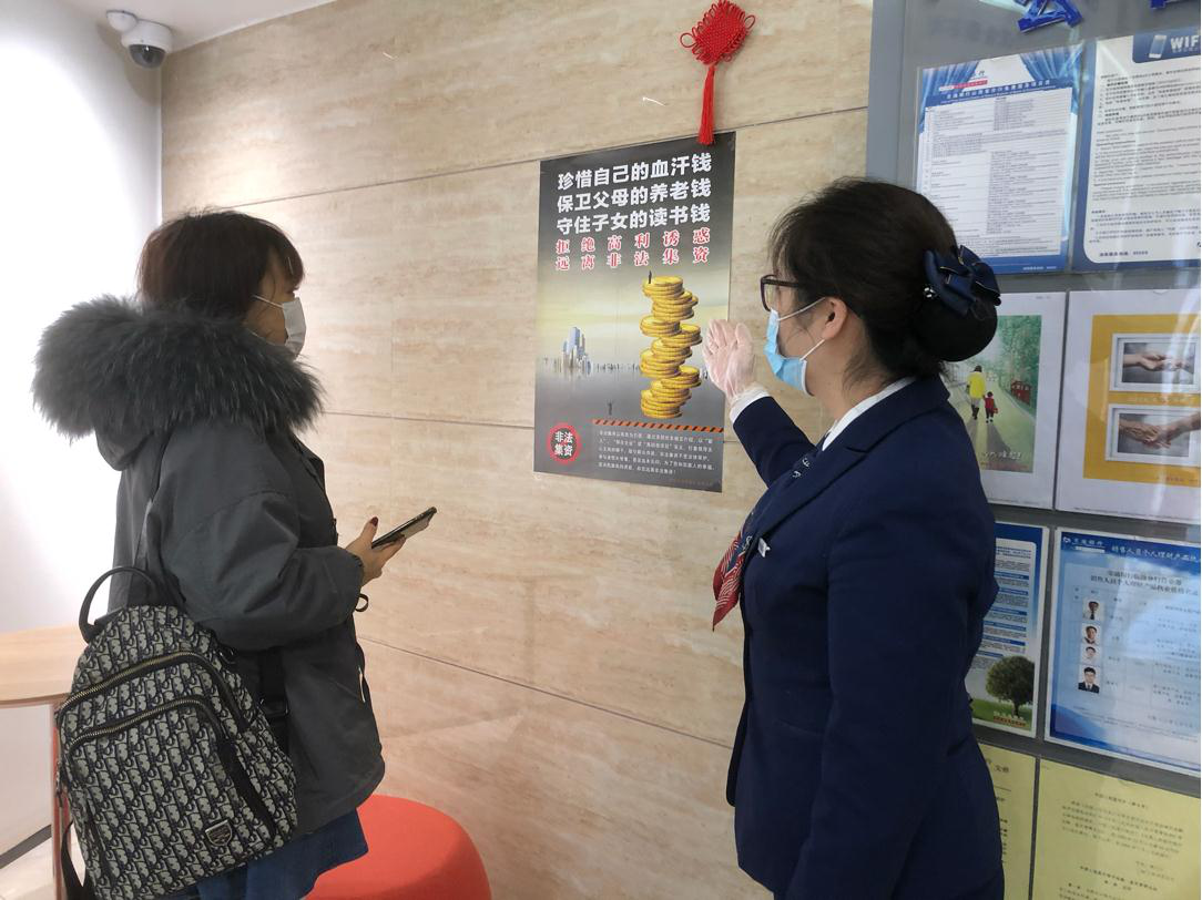 支行在廳堂醒目位置張貼了宣傳海報,在宣傳教育區(qū)設(shè)置了非法集資宣傳專區(qū),廳堂工作人員接待客戶時除了全面宣傳外,同時,根據(jù)客戶年齡及投資偏好等特征進(jìn)行針對性宣傳。