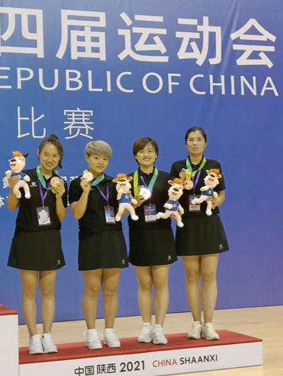 (圖為頒獎(jiǎng)臺(tái)上,王佳(左一)獲得第十四屆全運(yùn)會(huì)毽球比賽銅牌)