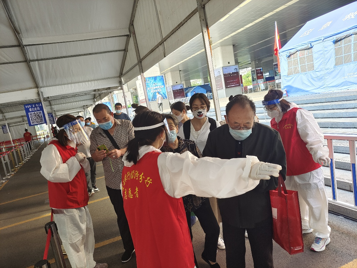 在臨汾西站出站口,志愿者們身著防護(hù)服和紅色志愿馬甲、佩戴防護(hù)面屏和防護(hù)手套,對(duì)每一個(gè)來臨人員仔細(xì)排查,確保不漏查一人,不漏查一碼,頂著30多度的高溫,不知疲倦的穿梭在人群中。他們的額頭上,早已是汗珠密布,防護(hù)服下,貼身的衣服早已被汗水浸的透濕……
