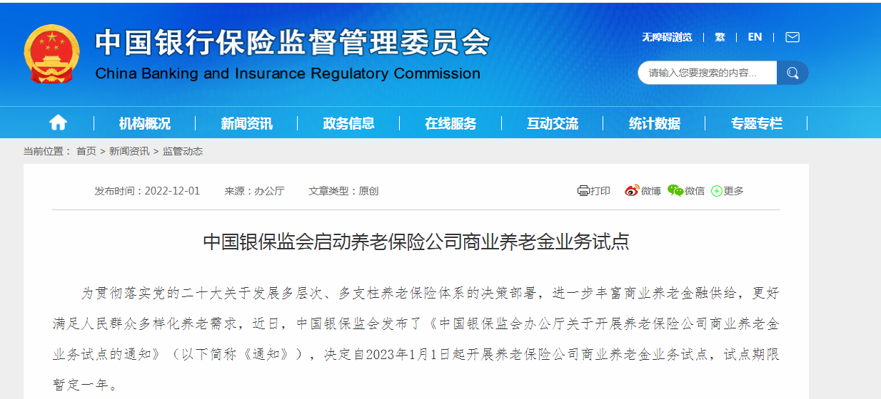 據(jù)銀保監(jiān)會(huì)網(wǎng)站12月1日消息,為貫徹落實(shí)黨的二十大關(guān)于發(fā)展多層次、多支柱養(yǎng)老保險(xiǎn)體系的決策部署,進(jìn)一步豐富商業(yè)養(yǎng)老金融供給,更好滿足人民群眾多樣化養(yǎng)老需求,近日,中國(guó)銀保監(jiān)會(huì)發(fā)布了《中國(guó)銀保監(jiān)會(huì)辦公廳關(guān)于開(kāi)展養(yǎng)老保險(xiǎn)公司商業(yè)養(yǎng)老金業(yè)務(wù)試點(diǎn)的通知》,決定自2023年1月1日起開(kāi)展養(yǎng)老保險(xiǎn)公司商業(yè)養(yǎng)老金業(yè)務(wù)試點(diǎn),試點(diǎn)期限暫定一年。 試點(diǎn)期限和范圍 自2023年1月1日起,在北京市、上海市、江蘇省、浙江省、福建省、山東省、河南省、廣東省、四川省、陜西省等10個(gè)省(市)開(kāi)展商業(yè)養(yǎng)老金業(yè)務(wù)試點(diǎn)。試點(diǎn)期限暫定一年。 參與試點(diǎn)養(yǎng)老保險(xiǎn)公司為:中國(guó)人民養(yǎng)老保險(xiǎn)有限責(zé)任公司、中國(guó)人壽養(yǎng)老保險(xiǎn)股份有限公司、太平養(yǎng)老保險(xiǎn)股份有限公司、國(guó)民養(yǎng)老保險(xiǎn)股份有限公司。 試點(diǎn)內(nèi)容 創(chuàng)新發(fā)展養(yǎng)老保險(xiǎn)公司商業(yè)養(yǎng)老金業(yè)務(wù),提供包括養(yǎng)老賬戶管理、養(yǎng)老規(guī)劃、資金管理和風(fēng)險(xiǎn)管理等服務(wù),滿足客戶生命周期內(nèi)多樣化養(yǎng)老需求。 探索利用多渠道開(kāi)展商業(yè)養(yǎng)老金業(yè)務(wù),更廣泛地覆蓋和觸達(dá)廣大人民群眾,特別是新產(chǎn)業(yè)、新業(yè)態(tài)從業(yè)人員和靈活就業(yè)人員。允許企事業(yè)單位以適當(dāng)方式,依法合規(guī)為個(gè)人提供交費(fèi)支持。 探索建立與商業(yè)養(yǎng)老金業(yè)務(wù)特點(diǎn)相適應(yīng)的銷售長(zhǎng)期激勵(lì)機(jī)制、風(fēng)險(xiǎn)管控機(jī)制和投資管理機(jī)制等,堅(jiān)持長(zhǎng)期投資、價(jià)值投資、審慎投資,開(kāi)展養(yǎng)老資金長(zhǎng)周期管理。 試點(diǎn)要求 各公司應(yīng)加強(qiáng)對(duì)商業(yè)養(yǎng)老金業(yè)務(wù)試點(diǎn)的統(tǒng)一領(lǐng)導(dǎo),健全工作機(jī)制,加大資源投入,加強(qiáng)制度建設(shè),切實(shí)提升投資管理和風(fēng)險(xiǎn)管控能力,有序建立適合商業(yè)養(yǎng)老金業(yè)務(wù)發(fā)展要求的治理結(jié)構(gòu)、組織架構(gòu)、考核體系等。 各公司應(yīng)建立完善的商業(yè)養(yǎng)老金信息系統(tǒng),確保具備與業(yè)務(wù)需求相適應(yīng)的處理能力,能夠高效、穩(wěn)定地支持商業(yè)養(yǎng)老金業(yè)務(wù)賬戶管理、產(chǎn)品管理、信息披露、客戶服務(wù)等,加強(qiáng)客戶信息保護(hù),健全網(wǎng)絡(luò)安全防護(hù)體系。 各公司應(yīng)審慎制定發(fā)展規(guī)劃,穩(wěn)步推進(jìn)試點(diǎn)各項(xiàng)工作,可在試點(diǎn)區(qū)域內(nèi)不設(shè)分支機(jī)構(gòu)經(jīng)營(yíng)商業(yè)養(yǎng)老金業(yè)務(wù),但應(yīng)具備與業(yè)務(wù)發(fā)展相適應(yīng)的服務(wù)能力。 各公司應(yīng)于每季度結(jié)束后5個(gè)工作日內(nèi),向銀保監(jiān)會(huì)和試點(diǎn)地區(qū)銀保監(jiān)局報(bào)送商業(yè)養(yǎng)老金業(yè)務(wù)試點(diǎn)報(bào)告。 試點(diǎn)地區(qū)銀保監(jiān)局應(yīng)密切關(guān)注業(yè)務(wù)發(fā)展和市場(chǎng)反映,加強(qiáng)業(yè)務(wù)監(jiān)管,對(duì)試點(diǎn)過(guò)程中遇到的困難和問(wèn)題,及時(shí)向銀保監(jiān)會(huì)報(bào)告。 下一步,銀保監(jiān)會(huì)將密切跟蹤試點(diǎn)進(jìn)展,規(guī)范業(yè)務(wù)經(jīng)營(yíng),加強(qiáng)監(jiān)督管理,切實(shí)維護(hù)消費(fèi)者合法權(quán)益。同時(shí),及時(shí)評(píng)估總結(jié)試點(diǎn)情況,研究完善監(jiān)管制度,適時(shí)推廣試點(diǎn)經(jīng)驗(yàn),推動(dòng)養(yǎng)老保險(xiǎn)公司更好服務(wù)多層次、多支柱養(yǎng)老保險(xiǎn)體系建設(shè)。 |