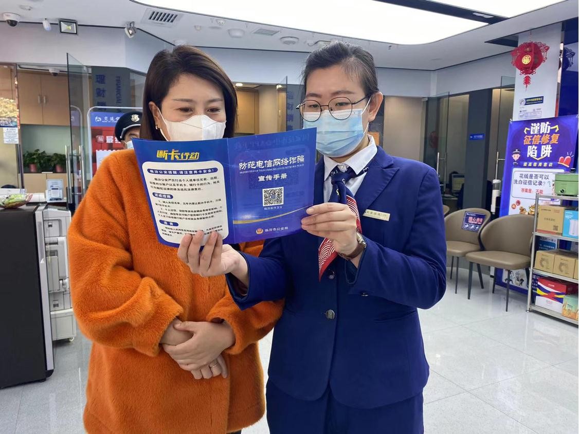 支行組織員工立足廳堂、深入商圈,通過(guò)發(fā)放宣傳折頁(yè)及面對(duì)面宣傳的方式,向到店客戶以及周邊商戶開(kāi)展了“斷卡”行動(dòng)宣傳,普及了售賣兩卡的社會(huì)危害及嚴(yán)重后果,引導(dǎo)客戶規(guī)范使用賬戶,正確使用銀行卡,自覺(jué)抵制買賣、租借銀行卡及電話卡的違法行為,筑牢自身的安全防線。