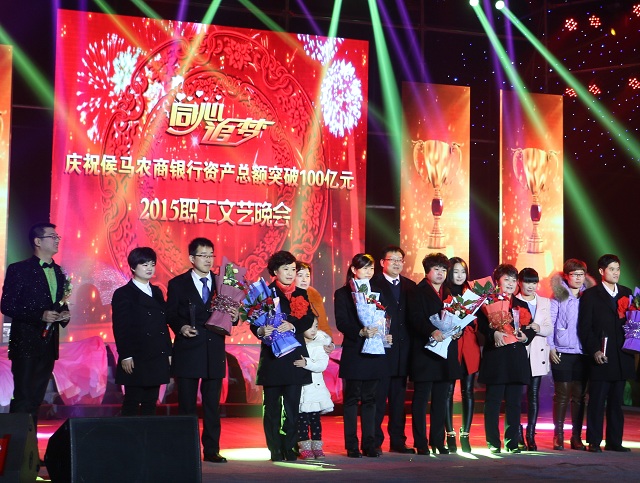 19時(shí)許,伴隨著一首溫馨的MV《商行歡迎您》,晚會(huì)正式拉開了精彩帷幕。李俊躍董事長首先發(fā)表了熱情洋溢的致辭,他講道:自掛牌四年來,在各級(jí)各部門領(lǐng)導(dǎo)的關(guān)心和支持下,全行上下勵(lì)精圖治、奮力拼搏、內(nèi)強(qiáng)素質(zhì)、外樹形象,取得了一系列驕人業(yè)績,并邁出了歷史性的“走出去”經(jīng)營步伐。2015年,在經(jīng)濟(jì)下行壓力加大、同業(yè)競爭日趨激烈的嚴(yán)峻局面下,全行多措并舉,逆市而上,取得了存款余額突破70億元、資產(chǎn)總額達(dá)到100億元、理財(cái)產(chǎn)品募集金額累計(jì)超17億元、資金營運(yùn)利潤突破1億元、人均創(chuàng)利86.3萬元等一系列優(yōu)異業(yè)績,繼續(xù)保持了在全市、全省領(lǐng)先發(fā)展的良好態(tài)勢。本場晚會(huì),正是給予長期以來關(guān)注、關(guān)心、關(guān)愛商行發(fā)展的各級(jí)領(lǐng)導(dǎo)、社會(huì)各界,以及商行員工及家屬的一份答謝。隨后,行領(lǐng)導(dǎo)班子、中層干部走上舞臺(tái),與臺(tái)下的全體員工一道,在李董事長的帶領(lǐng)下齊聲宣誓商行誓詞,高呼侯馬農(nóng)商銀行企業(yè)愿景,向參加晚會(huì)的社會(huì)各界人士展示了該行團(tuán)結(jié)一心、眾志成城的精神風(fēng)貌,得到了在場觀眾的熱烈掌聲。