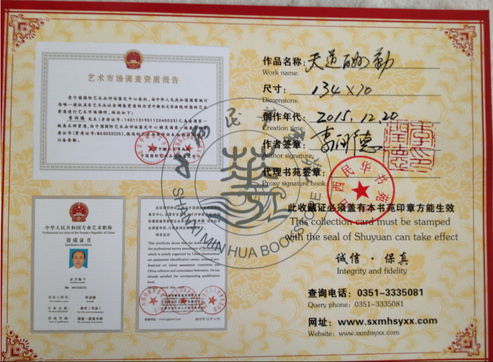 2016年1月14日,臨汾金融官方微信圈一元起拍作品《春曉》最后成交價(jià)60元。剛好基金入賬3元。 今日拍品《天道酬勤》 行草 作者:李潤(rùn)德,尺寸:四尺整張 規(guī)格:134*70 沒(méi)有裝裱 軟件便于收藏 作者:李潤(rùn)德:山西太原人,書法本科,國(guó)家一級(jí)美術(shù)師(書法)中國(guó)書法家協(xié)會(huì)會(huì)員,中國(guó)藝術(shù)品收藏協(xié)會(huì)副主席,中國(guó)黃河書畫院院士,山西民華書苑藝術(shù)顧問(wèn),山西民華培訓(xùn)學(xué)校教授,本人作品已被美國(guó)郵票局發(fā)行。 此作品證書