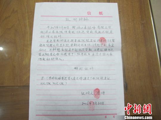 多位村民反映山西浮山農(nóng)村商業(yè)銀行東張支行存在管理漏洞導(dǎo)致還款未能入賬。圖為山西省臨汾市浮山縣強(qiáng)峰鋼鐵有限公司財(cái)務(wù)會(huì)計(jì)李峰關(guān)于以李先鋒為借款擔(dān)保人,交給高文峰兩張總價(jià)值10萬(wàn)元的股金證的說(shuō)明材料!±钅 攝