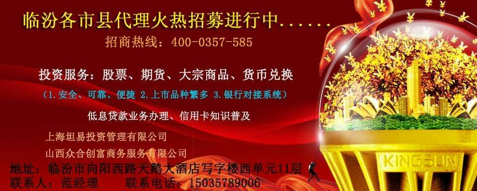 山西眾合創(chuàng)富商務服務有限公司,上海坦易投資管理有限公司強勢入駐臨汾,現(xiàn)向本地區(qū)各縣市誠招代理。 本公司一家綜合性金融服務平臺,主要從事股票、期貨、大宗商品、資產(chǎn)管理、信用卡咨詢、小額信貸等業(yè)務,我們不需要您的資金投入,只需要您的精力投入,輕松實現(xiàn)您的創(chuàng)業(yè)夢想,我們歡迎您的加入! 地址:臨汾市堯都區(qū)向陽西路天鵝大酒店西單元11層。 聯(lián)系方式:15035789006. |