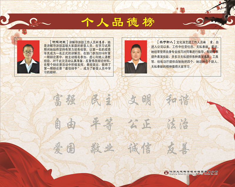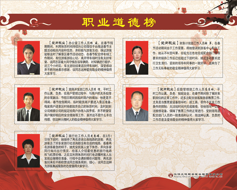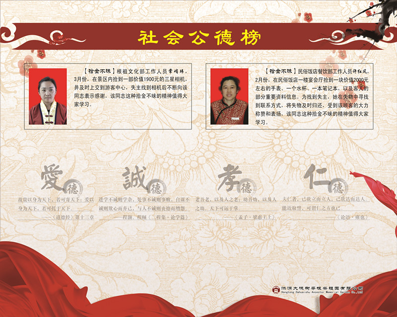 4月18日,洪洞大槐樹景區(qū)公布2016年第一季度善行義舉好人榜名單。為了培育景區(qū)員工的社會主義核心價值觀,鞏固精神文明創(chuàng)建成果,引導員工自覺履行法定義務、社會責任、家庭責任,力爭形成“人人做好人,好人做好事,好事就上榜,好人有好報”的社會風尚,景區(qū)自2014年10月開展“善行義舉好人榜”活動,至今已開展6期。 個人品德榜 社會公德榜 職業(yè)道德榜 附:善行義舉好人榜——“四德”的關系 個人品德、職業(yè)道德、家庭美德、社會公德這四種道德是一個有機的統(tǒng)一體,其外延由大到小,內涵由淺到深,共同構成一個完善的道德體系。在四德建設中,人的能動性及個人品德建設是事關重要的,加強社會主義道德建設、構建和諧文化體系的進程,個人的修養(yǎng)特別是個人品德的修養(yǎng)是樹立四德意識、規(guī)范言行舉止、建設和諧家庭、模范地做好工作、維護社會和諧的基礎。可以說,個人品德修養(yǎng)猶如石投水中引起環(huán)形水波一樣,是四德建設的波源和基點。實際上,這是要求我們每個人在道德建設過程中自覺地以自身品德修養(yǎng)為起點,首先向內作工夫。個人品德、職業(yè)道德、家庭美德、社會公德體現(xiàn)為一種系列關系,個人品德是系列之始,亦即個人品德、修養(yǎng)、構建和諧家庭、建設和諧社會有內在的統(tǒng)一性,個人品德修養(yǎng)是社會公德的擴大,家庭美德、職業(yè)道德、社會公德是個人品質的外化與擴大。不僅如此,在道德建設與人的關系中,人還是道德的體現(xiàn)者,只有個人具備優(yōu)良品德修養(yǎng)才能由己及人,才能由己及家庭、集體和社會。我們常說,榜樣的力量是無窮的,和諧文化中道德建設也是如此。 |