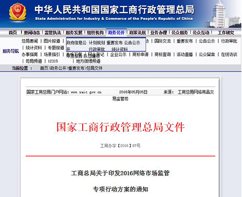 工商總局官網截圖 人民網北京5月6日電 (朱一梵)近日,工商總局網站發(fā)布《工商總局關于印發(fā)2016網絡市場監(jiān)管專項行動方案的通知》(以下簡稱“《通知》”),《通知》顯示,今年5-11月將治理互聯(lián)網虛假違法廣告。充分發(fā)揮整治虛假違法廣告部際聯(lián)席會議作用,加強部門間的協(xié)調溝通、信息共享和執(zhí)法協(xié)作,開展互聯(lián)網金融廣告專項整治。 通知指出,專項行動分為三個階段組織實施:5月上中旬為動員部署階段,各地工商、市場監(jiān)管部門制定工作方案,部署整治工作任務,組織媒體加大宣傳,營造良好輿論氛圍;5月下旬-11月中旬為集中整治階段,根據(jù)具體任務措施,針對重點問題進行專項治理;11月份為督查評估階段,督查整治工作,鞏固整治成果,總結經驗做法,分析問題不足。 在具體任務措施方面,專項行動包括治理互聯(lián)網虛假違法廣告、落實網店實名制等九個方面。將重點整治網絡交易平臺和網絡商標侵權、銷售假冒偽劣商品、虛假宣傳、刷單炒信等突出違法問題。將查辦一批大案要案,公布一批典型案例,震懾違法經營者,構建社會共治格局。 |