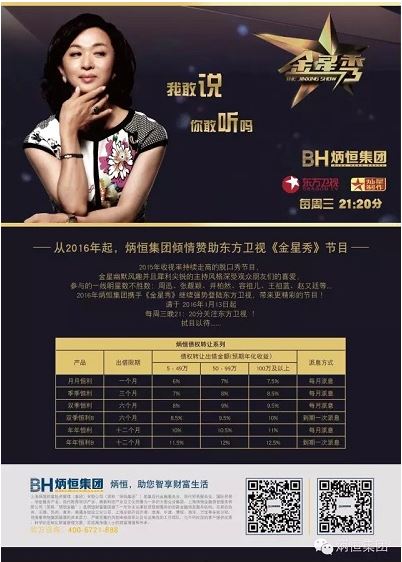 記者在炳恒集團官網(wǎng)上查詢到,2016年2月3日起,東方衛(wèi)視的《金星秀》節(jié)目由炳恒集團—恒有錢贊助,炳恒集團同時推出了年化收益率達到12%的理財產(chǎn)品,其套路和一些同行類似,通過贊助知名度較高的明星,由明星為自己企業(yè)和產(chǎn)品背書。除了《金星秀》以外,炳恒集團的贊助對象還包括2014年上海娛樂頻道《廣場大民星》節(jié)目;2015年3月《2015姜昆相聲巡演-上海站》;BIGBANG2015年世界巡演“BIGBANG 2015 WORLD TOUR ”中2015年6月21日的上海站演唱會;2015年7月,華誼ELLE之夜等。另有報道稱,2015年2月6日,歌手羅中旭參加了炳恒集團的年會,師勝杰、姜昆、楊洪基、蔡明等二十多位藝術(shù)家發(fā)去了祝福。由此可見,炳恒集團這些年在明星身上大把花錢,可謂不惜血本。今天有消息稱,炳恒集團還曾經(jīng)高調(diào)地在700多個銀行網(wǎng)點投放廣告。