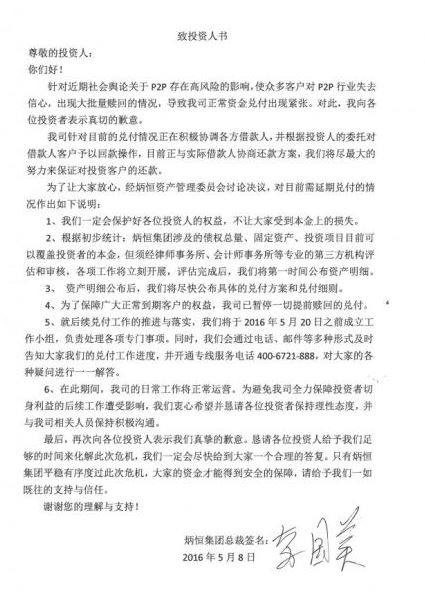 炳恒集團在今天發(fā)布的《致投資人書》里承認,公司正常資金兌付出現(xiàn)緊張,針對目前的兌付情況正在積極協(xié)調(diào)各方借款人,并根據(jù)投資人的委托對借款人客戶予以回款操作,目前正與實際借款人協(xié)商還款方案,將盡最大努力來保證對投資人的還款。