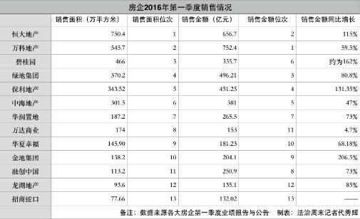 恒大萬科爭榜首 萬達跌出前十 “銷售面積24299萬平方米,銷售金額18524億元”,這是怎樣的一個概念? 如果求算平均每平方米的價格,那么其約為7623元;如果以中國14億人口計算,那么18524億元相當(dāng)于每人貢獻了1323元人民幣。 這就是中國房地產(chǎn)市場2016年第一季度交出的答卷。 國家統(tǒng)計局?jǐn)?shù)據(jù)顯示,2016年第一季度商品房銷售面積同比增長33.1%。其中,住宅銷售面積增長35.6%,辦公樓銷售面積增長34.4%,商業(yè)營業(yè)用房銷售面積增長8.5%。 此外,2016年第一季度商品房銷售額同比增長54.1%。其中,住宅銷售額增長60.3%,辦公樓銷售額增長69.4%,商業(yè)營業(yè)用房銷售額增長8.2%。 “受益于相對寬松的貨幣信貸環(huán)境,以及政府支持居民合理住房需求的系列舉措,國內(nèi)住宅需求加速釋放,加之去年房產(chǎn)銷售的基數(shù)相對較低,全國房地產(chǎn)銷售明顯回升。”易居研究院智庫中心研究總監(jiān)嚴(yán)躍進對法治周末記者說。 房地產(chǎn)江湖暖意縈繞,各家房企表現(xiàn)又是如何呢?伴隨著第一季度業(yè)績的陸續(xù)發(fā)布,各大房企在地產(chǎn)市場中的成績亦有了結(jié)果。 據(jù)此,法治周末記者統(tǒng)計了在A股或港股上市13家上市房企的銷售情況。 恒大、萬科爭榜首 在房地產(chǎn)的江湖中,萬科可謂是始終穩(wěn)坐房企一哥的位置。 萬科第一季度的業(yè)績呈現(xiàn)亦維持了這一傳統(tǒng)。統(tǒng)計結(jié)果顯示,萬科第一季度銷售金額為752.4億元,蟬聯(lián)榜首。 然而,萬科此次卻遭遇了一名強有力的競爭“勁敵”——恒大地產(chǎn)。 恒大地產(chǎn)財報顯示,在第一季度的運營中實現(xiàn)銷售金額656.7億元,僅比萬科少12.7%。 “雖然恒大在銷售金額上還略遜于萬科,但是其銷售金額的增長速度已遠遠超過萬科!眹(yán)躍進說。 統(tǒng)計結(jié)果顯示,恒大地產(chǎn)銷售金額較去年同期同比增長115%;萬科則為59.5%,增長幅度遠遠低于恒大地產(chǎn)。 這意味著,單以銷售金額看,恒大地產(chǎn)與萬科的差距已從去年一季度的156億元大幅減少至55億元,保持著高速增長勢頭的恒大地產(chǎn)與萬科的差距正迅速縮小。 “按照恒大地產(chǎn)如此的增速,未來房企一哥的位置不排除會有易主的可能。”房地產(chǎn)專家劉慶海對法治周末記者說。 事實上,法治周末記者注意到,恒大地產(chǎn)在第一季度銷售面積上已然趕超萬科。 統(tǒng)計數(shù)據(jù)結(jié)果顯示,在第一季度的銷售中,恒大地產(chǎn)實現(xiàn)750.4萬平方米的銷售面積,位居行業(yè)第一位;而萬科則以545.7萬平方米的銷售面積位居第二。 “恒大地產(chǎn)的成功原因之一是得益于其推出的‘無理由退房’銷售策略。無理由退房保證購房者零風(fēng)險,免除購房者的后顧之憂?梢哉f該策略提升了恒大地產(chǎn)的品牌,增加了購房者對恒大地產(chǎn)的信任,間接對其業(yè)績起到了促進作用!眲c海對法治周末記者說。 此前恒大地產(chǎn)曾公告稱,2016年全年的合約銷售目標(biāo)為2000億元,據(jù)此計算,2016年第一季度恒大地產(chǎn)已完成銷售目標(biāo)的32.8%。 此外,綜合13家上市房企的銷售情況來看,萬科與恒大地產(chǎn)的銷售情況已經(jīng)遠遠地超出其他11家房企一大截。 統(tǒng)計數(shù)據(jù)結(jié)果顯示,跟隨萬科、恒大地產(chǎn)之后的是綠地集團,銷售金額為496.21億元;此外,位列銷售額前10名的其他房企依次為保利地產(chǎn)、中海地產(chǎn)、碧桂園、華潤置地、融創(chuàng)中國、 金地集團 、 華夏幸福 。 金地逆襲萬達跌出前十 在13家上市房企第一季度的銷售表現(xiàn)中,有兩家存在著巨大反差的企業(yè)十分引人注意,它們是金地集團與萬達商業(yè)。 “招保萬金”一說曾經(jīng)在房地產(chǎn)市場中廣為流傳,一度被認(rèn)為是上市房企中的四強,這其中“金”字指代的就是金地集團。 然而,時至今日,“招保萬金”的說法因為金地集團的淪落已經(jīng)成為少有提及的說辭。在萬科、保利早已跨入千億房企之列時,金地集團的業(yè)績卻是難以有比較扎眼的表現(xiàn)。 但這次卻有不同。 統(tǒng)計數(shù)據(jù)結(jié)果顯示,金地集團在第一季度的表現(xiàn)中擠進前十,以銷售金額204.1億元的成績位列第九名。 此外,金地集團亦憑借206.5%的高增長位列銷售金額增速之首。 與此同時,在銷售面積上金地集團實現(xiàn)138.2萬平方米的銷售業(yè)績,雖然在房企銷售面積前十名中排在末尾,但是增幅卻實現(xiàn)134.6%。 “由于此前金地集團土地儲備工作積極到位,整個銷售業(yè)績在第一季度提升是比較明顯的。”嚴(yán)躍進評價,“如果銷售額的增幅超過銷售面積,說明房企的定價比較強勢,所以會有較明顯的漲價和業(yè)績改善。” 相對于金地集團的積極上進,萬達商業(yè)則表現(xiàn)出不一樣的反差。 統(tǒng)計數(shù)據(jù)顯示,萬達商業(yè)第一季度的銷售金額為153億元,位居13家上市房企的第11位,跌出前十;銷售面積為174萬平方米,位居13家上市房企的第8位。 與此同時,令人意外的是萬達商業(yè)的地產(chǎn)銷售金額較上年同期僅增長4.7%。 “萬達一季度業(yè)績增幅并不明顯實際上與其轉(zhuǎn)型輕資產(chǎn)做服務(wù)商的戰(zhàn)略有密切關(guān)系!眲c海說,“實際上,萬達已經(jīng)開始在有意識的忽略房地產(chǎn)業(yè)務(wù)