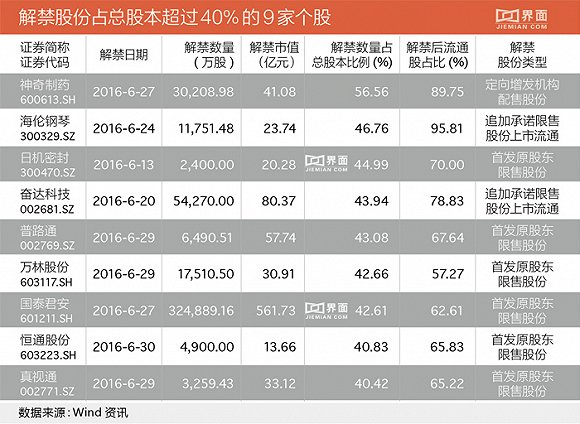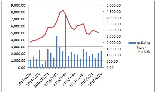 臨近6月,解禁壓力越來(lái)越受到市場(chǎng)關(guān)注。申萬(wàn)宏源分析師王佳音指出,即將到來(lái)的6月份將迎來(lái)2016年的第一波解禁小高潮,解禁市值預(yù)計(jì)將達(dá)到2500億元。 據(jù)Wind資訊統(tǒng)計(jì)顯示,2016年6月份,滬深A股解禁數(shù)量高達(dá)158.11億股,按照5月27日收盤(pán)價(jià)進(jìn)行計(jì)算,解禁市值逼近2500億元,為2016年以來(lái)最高值。而從過(guò)去兩年A股市場(chǎng)的情況來(lái)看,雖然存在大牛市的擾動(dòng)因素,但整體上解禁市值與股市行情的走勢(shì)還是呈現(xiàn)出負(fù)相關(guān)的關(guān)系。 近2年上證綜指走勢(shì)與解禁市值情況 值得注意的是,去年同期解禁市值高達(dá)7674.71億元,一方面去年上半年的牛市行情使眾多上市公司的股價(jià)創(chuàng)出歷史新高,解禁市值大幅增加;另一方面當(dāng)月163家上市公司合計(jì)解禁317.82億股也創(chuàng)下了2013年9月份以來(lái)的新高。 從解禁股份類型來(lái)看,整個(gè)6月份共有97家公司限售股解禁,其中有44家公司屬于首發(fā)原股東限售股份解禁,38家為定向增發(fā)機(jī)構(gòu)配售股份解禁,7家為股權(quán)激勵(lì)限售股份解禁,5家為追加承諾限售股份解禁,兩家股權(quán)分置限售股份解禁,一家一般配股股份解禁。 97家上市公司解禁類型 據(jù)Wind資訊數(shù)據(jù)統(tǒng)計(jì),前十大限售股解禁公司合計(jì)解禁101.90億股,按5月27日收盤(pán)價(jià)計(jì)算,解禁總市值達(dá)到1417.78億元,占整個(gè)6月份總解禁股份和市值的比例分別為64.45%和57.76%。其中,國(guó)泰君安(601211.SH)一家的解禁股份就達(dá)到32.49億股,解禁市值高達(dá)561.73億元;另一家綠地控股(600606.SH)的解禁數(shù)量也達(dá)到了27.05億股,解禁市值也超過(guò)了300億元。除了這兩家之外,中國(guó)鋁業(yè)(601600.SH)的解禁股份也超過(guò)了10億,達(dá)到了13.79億股,涉及金額為54.90億元。 6月份前十大限售股解禁公司 而從解禁股份占總股本比例的角度看,超過(guò)40%的共有9家,具體情況如下表所示: 雖然在近日舉行的2016年第二期保薦代表人培訓(xùn)會(huì)上,監(jiān)管層要求參與配套融資的實(shí)際控制人或控股股東,并購(gòu)重組實(shí)施完成后的持股比例提高的,在原有的定增新股需要鎖定36個(gè)月規(guī)定之外,所持老股也承諾鎖定12個(gè)月。不過(guò)上述9家上市公司均不存在以上情況,換言之,這9家上市公司表中顯示的解禁數(shù)量不會(huì)減少,因此上述9只股票未來(lái)一段時(shí)間在二級(jí)市場(chǎng)所承受的拋壓或?qū)⒕薮蟆?/font> 一般而言,解禁市值與減持金額存在很強(qiáng)的正相關(guān)性。而且值得注意的是,在行情向好的時(shí)候,市場(chǎng)流動(dòng)性好,減持對(duì)市場(chǎng)流動(dòng)性沖擊不太明顯;但是如果在市場(chǎng)下跌過(guò)程中,流動(dòng)性本身就差,減持對(duì)股票價(jià)格的沖擊會(huì)比較大。因此在目前市場(chǎng)偏弱的環(huán)境下,即將到來(lái)的解禁小高潮或?qū)⑦M(jìn)一步加重本就弱勢(shì)的行情,對(duì)于高解禁金額的股票,投資者需高度警惕。