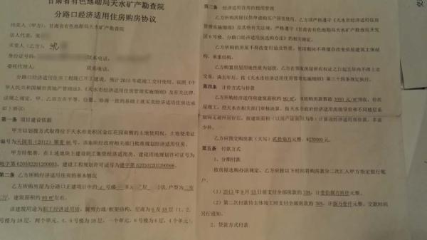 簽轉(zhuǎn)讓協(xié)議時,沈洋為每一戶買家都提供了大體相同的《甘肅省有色地勘局天水礦產(chǎn)勘察院分路口經(jīng)濟適用住房購房協(xié)議》,落款處有沈洋的個人簽名,同時還加蓋了礦勘院的公章,落款時間為2013918日。