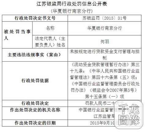 6月22日,中國銀監(jiān)會發(fā)布蘇銀監(jiān)罰〔2015〕31號行政處罰決定書,對華夏銀行南京分行違規(guī)進行處罰,罰款人民幣二十萬元。 資料顯示,華夏銀行南京分行法定代表人(主要負責(zé)人)姓名為何羽,2015年9月10日,華夏銀行南京分行因未按規(guī)定進行貸款資金支付管理與控制,按照《流動資金貸款管理暫行辦法》第三十九條、《中華人民共和國銀行業(yè)監(jiān)督管理法》第四十六條第(五)項以及《中國銀行業(yè)監(jiān)督管理委員會行政處罰辦法》(銀監(jiān)會令2007年第5號)第十五條第(一)項,被中國銀行業(yè)監(jiān)督管理委員會江蘇監(jiān)管局罰款人民幣二十萬元。 |