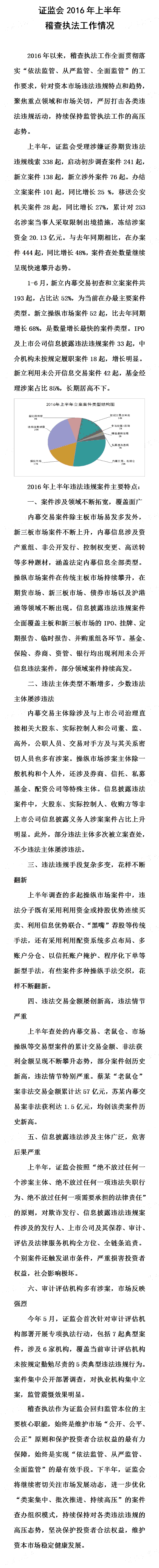 證監(jiān)會新聞發(fā)言人張曉軍今日通報了2016年上半年稽查執(zhí)法工作情況,據(jù)介紹上半年證監(jiān)會受理涉嫌證券期貨違法違規(guī)線索338起,啟動初步調(diào)查案件241起,新立案件138起,新立涉外案件76起。辦結(jié)立案案件101起,同比增長25%,移送公安機(jī)關(guān)案件28起,同比增長27%,累計對253名涉案當(dāng)事人采取限制出境措施,凍結(jié)涉案資金20.13億元。與去年同期相比,在辦案件444起,同比增長48%,案件查處數(shù)量繼續(xù)呈現(xiàn)快速攀升態(tài)勢。 |