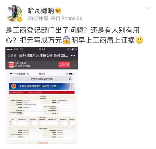 7月4日,深陷股權(quán)紛爭(zhēng)中的萬(wàn)科A(000002)復(fù)牌,幾無(wú)懸念,開(kāi)市即一字跌停,并最終報(bào)收于21.99元,下跌9.99%。若以萬(wàn)科A停牌前2372億元的A股總市值計(jì)算,經(jīng)此一日,其蒸發(fā)的市值就達(dá)到近240億元。 不過(guò),這一數(shù)字遠(yuǎn)沒(méi)有同日市場(chǎng)傳言的田樸珺參股某家公司負(fù)債高達(dá)200多億元來(lái)得讓人震驚。7月4日,網(wǎng)上曝出一張疑似企業(yè)信息的公示圖,圖中顯示,田樸珺作為合伙人,出資5萬(wàn)元,在2010年成立的這家公司,其2014年年報(bào)顯示,年?duì)I業(yè)總收入達(dá)到143億多元,負(fù)債達(dá)到200多億元,而納稅總額為零。 因與王石的親密關(guān)系,此次田樸珺也被卷入到“萬(wàn)寶之爭(zhēng)”的這場(chǎng)風(fēng)波中多次受到爭(zhēng)議。日前,在萬(wàn)科股東大會(huì)上,更有小股東當(dāng)場(chǎng)表示,曾經(jīng)做空過(guò)萬(wàn)科,就是在王石與田小姐在一起的時(shí)候。7月4日晚間,田樸珺對(duì)這份企業(yè)信息作出了澄清。她在其個(gè)人微博中援引了這張公示圖片,并表示“是工商登記部門(mén)出了問(wèn)題?還是有人別有用心?把元寫(xiě)成萬(wàn)元。明早上工商局上證據(jù)。” |