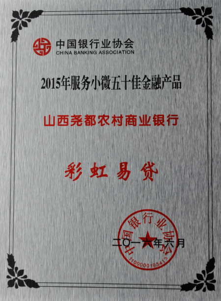 2015年度,在中國銀行業(yè)協(xié)會連續(xù)8年開展服務小微及三農(nóng)優(yōu)秀金融產(chǎn)品評選工作中,全國34家省(市)銀行業(yè)協(xié)會申報了的798個金融產(chǎn)品,經(jīng)過中國銀行業(yè)協(xié)會嚴格的初評、二審、實地抽查和終審,臨汾市堯都農(nóng)村商業(yè)銀行“彩虹易貸”被授予“2015年服務小微五十佳金融產(chǎn)品”榮譽稱號。