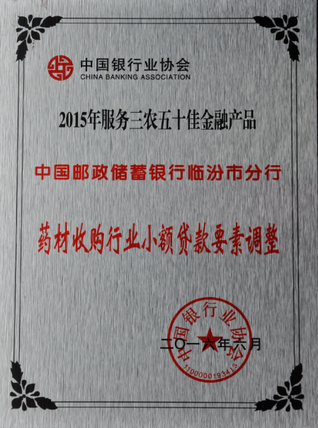 2015年度,在中國銀行業(yè)協(xié)會連續(xù)8年開展服務(wù)小微及三農(nóng)優(yōu)秀金融產(chǎn)品評選工作中,全國34家省(市)銀行業(yè)協(xié)會申報了的798個金融產(chǎn)品,經(jīng)過中國銀行業(yè)協(xié)會嚴(yán)格的初評、二審、實地抽查和終審,中國郵政儲蓄銀行臨汾市分行“藥材收購行業(yè)小額貸款要素調(diào)整”被授予“2015年服務(wù)三農(nóng)五十佳金融產(chǎn)品”榮譽稱號。 |
