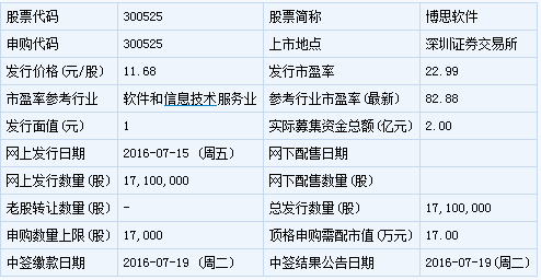 博思軟件此次發(fā)行總數(shù)為1710萬(wàn)股,網(wǎng)上發(fā)行1710萬(wàn)股,發(fā)行市盈率22.99倍,申購(gòu)代碼:300525,申購(gòu)價(jià)格:11.68元,單一帳戶申購(gòu)上限17000股,申購(gòu)數(shù)量500股整數(shù)倍。 【基本信息】 【公司簡(jiǎn)介】 軟件產(chǎn)品的開(kāi)發(fā)、銷售與服務(wù)。 【籌集資金將用于的項(xiàng)目】 |