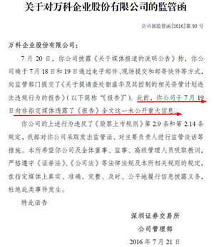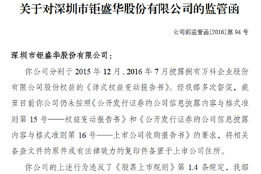 周四晚間,深交所公告稱,萬科于7月19日向非指定媒體透露了未公開重大信息。鉅盛華經(jīng)我部多次督促,仍未按要求上交股份權(quán)益變動(dòng)書。 深交所對(duì)鉅盛華監(jiān)管函 深交所對(duì)萬科監(jiān)管函 |