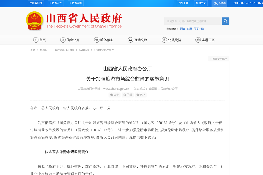 從7月開(kāi)始,山西省旅游局進(jìn)行了全域范圍內(nèi)的旅游市場(chǎng)秩序綜合監(jiān)管大檢查。據(jù)介紹,為了獲取市場(chǎng)最真實(shí)資料,檢查采取明查暗訪等形式展開(kāi)。 其中,暗訪重點(diǎn)涵蓋旅游交通工具、A級(jí)景區(qū)、住宿設(shè)施、應(yīng)急管理、安全責(zé)任制、資質(zhì)臺(tái)賬等方面,同時(shí)檢查旅游合同簽訂、旅游廣告信息、不合理低價(jià)團(tuán)費(fèi)、導(dǎo)游權(quán)益保障、“黑社”、“黑導(dǎo)”等市場(chǎng)秩序和文明旅游等問(wèn)題。 近年來(lái),隨著山西旅游市場(chǎng)監(jiān)管工作的不斷加強(qiáng)和完善,旅游市場(chǎng)秩序明顯好轉(zhuǎn),游客滿意度逐年提高。2015年山西省在游客滿意度調(diào)查中,獲得了90%以上的好評(píng)。但隨著旅游形勢(shì)的發(fā)展和旅游服務(wù)質(zhì)量提質(zhì)升級(jí)的迫切需求,旅游市場(chǎng)綜合監(jiān)管刻不容緩。 此次檢查將圍繞各級(jí)政府和旅游主管部門關(guān)于《國(guó)務(wù)院辦公廳關(guān)于加強(qiáng)旅游市場(chǎng)綜合監(jiān)管的通知》《山西省人民政府辦公廳關(guān)于加強(qiáng)旅游市場(chǎng)綜合監(jiān)管的實(shí)施意見(jiàn)》等文件精神的貫徹落實(shí)情況進(jìn)行展開(kāi),包括對(duì)旅游市場(chǎng)綜合監(jiān)管工作機(jī)制建立情況以及旅游市場(chǎng)綜合監(jiān)管責(zé)任清單落實(shí)情況的核查,如依法落實(shí)旅游市場(chǎng)監(jiān)管責(zé)任、創(chuàng)新旅游市場(chǎng)綜合監(jiān)管機(jī)制、全面提高旅游市場(chǎng)綜合監(jiān)管水平、提高旅游市場(chǎng)綜合監(jiān)管保障能力等方面的落實(shí)情況等。 此外,專項(xiàng)檢查內(nèi)容包括對(duì)大同市落實(shí)“一法兩條例”情況進(jìn)行專項(xiàng)檢查、對(duì)全省落實(shí)《國(guó)務(wù)院辦公廳關(guān)于加強(qiáng)旅游市場(chǎng)綜合監(jiān)管的通知》的督導(dǎo)檢查以及旅游市場(chǎng)綜合執(zhí)法檢查等。 據(jù)悉,此次檢查將進(jìn)一步整頓和規(guī)范旅游市場(chǎng)秩序,保障旅游從業(yè)人員和游客雙方權(quán)益,加大文明旅游宣傳引導(dǎo),提高旅游服務(wù)品質(zhì)。檢查組成員由山西省人大、旅游局、旅游發(fā)展改革領(lǐng)導(dǎo)組有關(guān)人員、旅游市場(chǎng)社會(huì)監(jiān)督員及媒體記者組成。 |